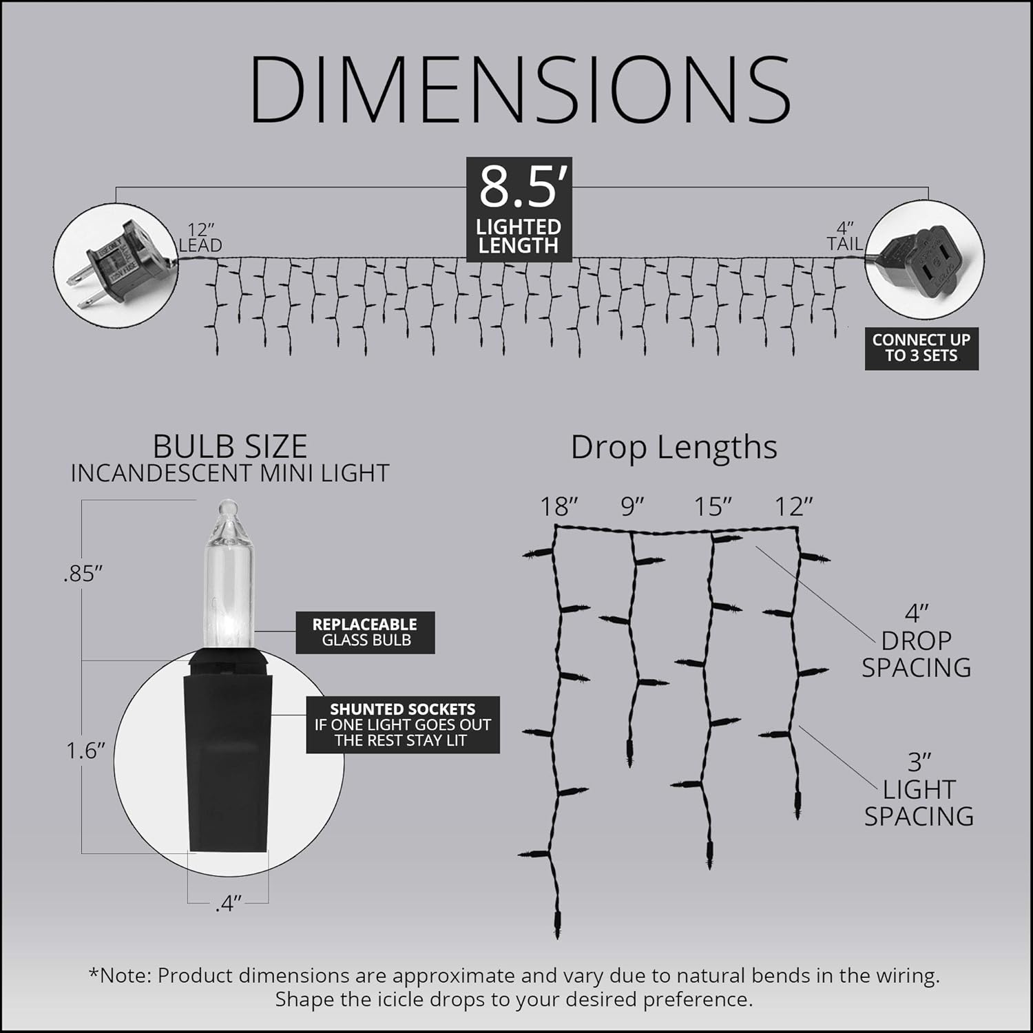 - ** INCANDESCENT ICICLE LIGHTS ** 150 traditional clear incandescent icicle lights on white wire, 27 vertical drops in lengths of 18", 9", 15", and 12"; approximately 8.5 ft. lighted length, 12” lead, 4” tail.