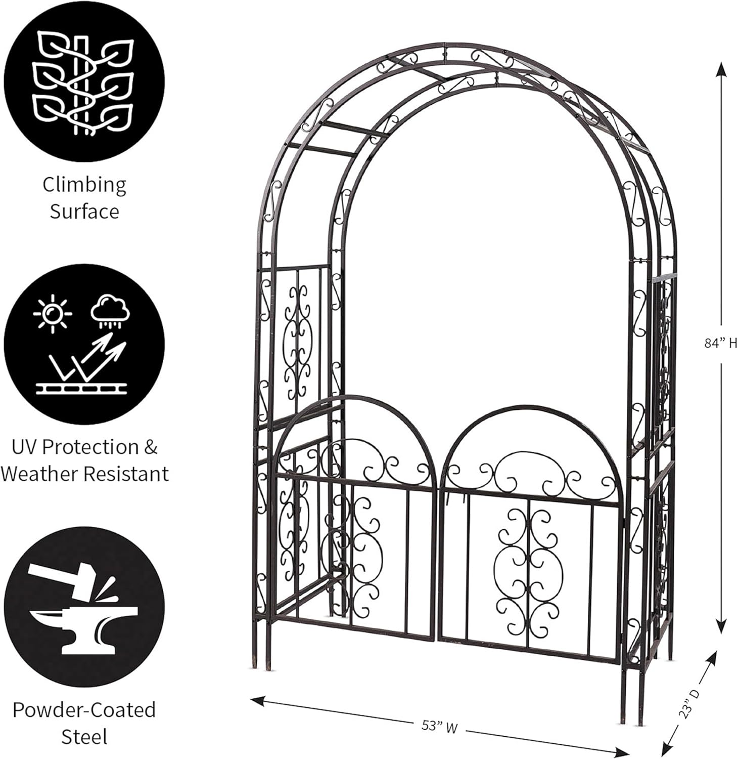 - ENHANCE YOUR GARGEN'S CHARM: Elevate your outdoor space with this exquisite metal garden arbor, standing at 84 inches tall. Perfect for supporting climbing plants and vines, it's ideal for creating a natural privacy fence or a vibrant landscape edging. Its elegant design adds a touch of sophistication to any garden, patio, or backyard.