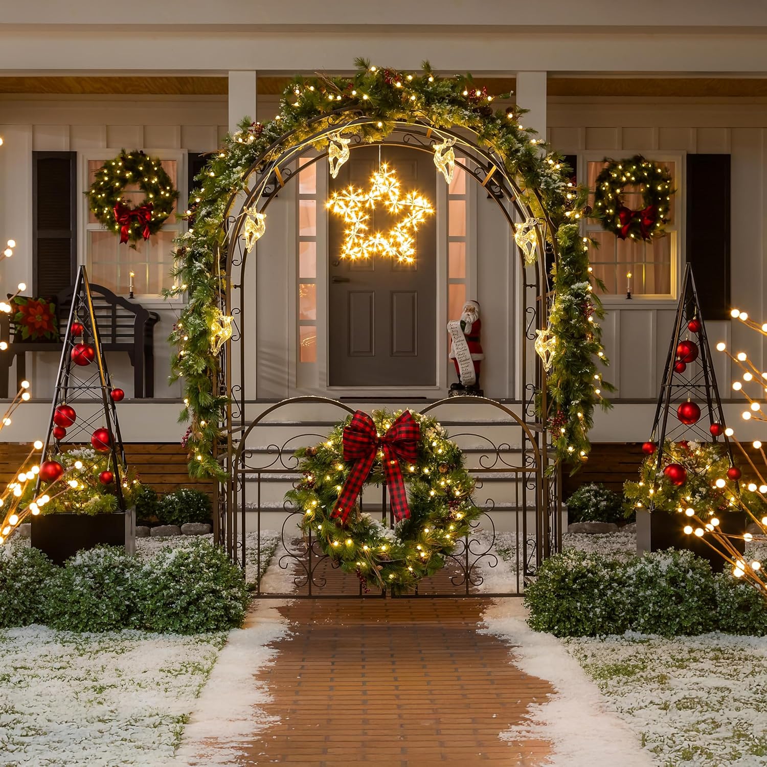 - TRANSFORN YOUR OUTDOOR AREA: This decorative metal arbor is a perfect blend of functionality and style. It serves as a stunning framework for garden parties or quiet evenings outdoors. Its size and design make it suitable for various landscaping themes, from traditional to modern. Use it to support a lush fence privacy screen or as a standalone garden centerpiece, and watch your outdoor space transform