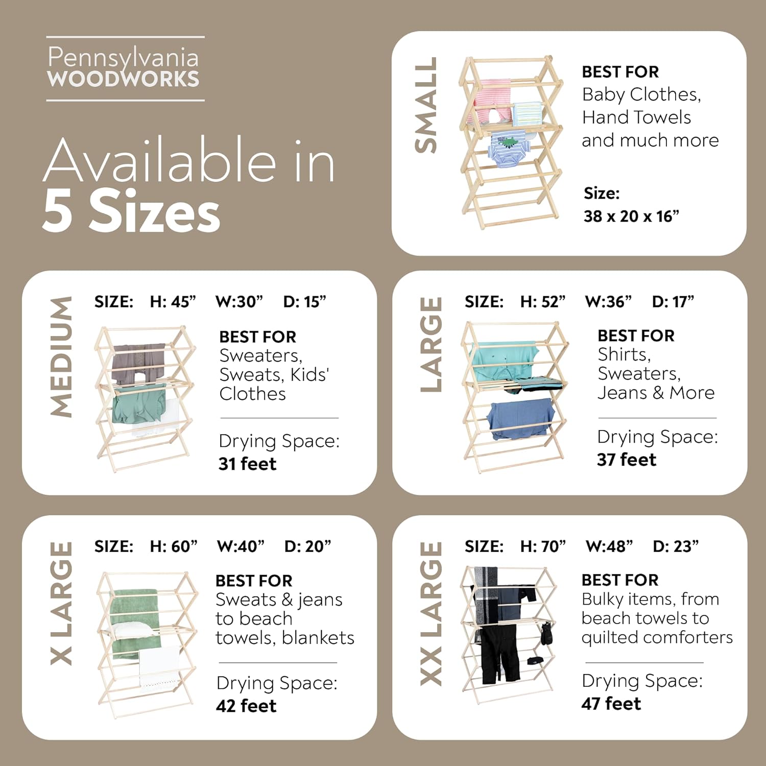 Pennsylvania Woodworks Clothes Drying Rack: Solid Maple Hard Wood Laundry Rack for Blankets, Towels, Bedding & More, Heavy Duty Folding Drying Rack, Made in USA, No Assembly Needed, XXLarge