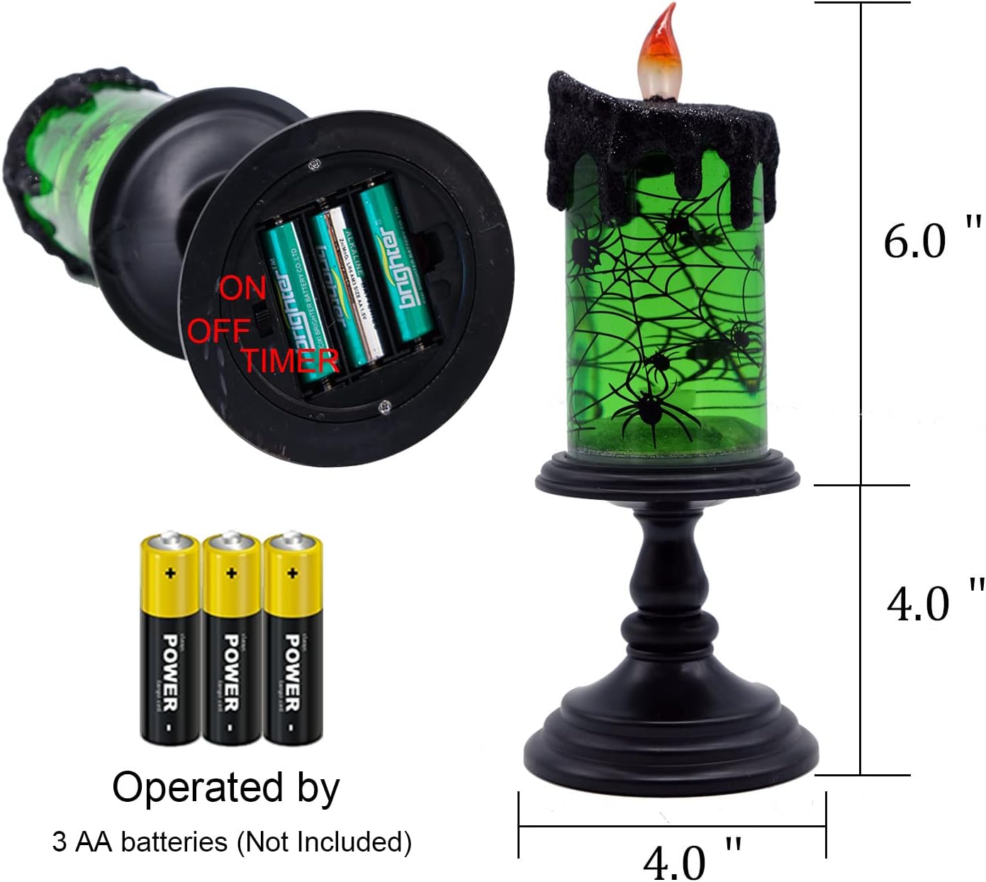 - Material: This snow globe candle is mady by resin and plastic, built-in motor swirl the water like the SPIDER spinning around the candle. Diameter 4 inches and Height 10 inches, come with Styrofoam clam-shell package.