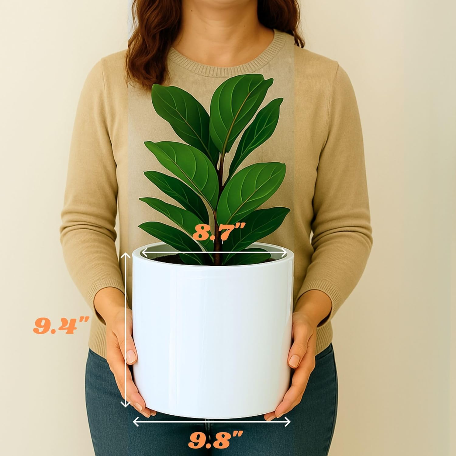 - THE PERFECT POT SIZE FOR YOUR PLANTS – Each glossy flower pot is 9.8” in outer diameter and 8.7” in inner diameter, allowing you to conveniently fit your favorite plant. Dimensions: Outer width: 9.8" | Inner width: 8.7" | Height: 9.4"