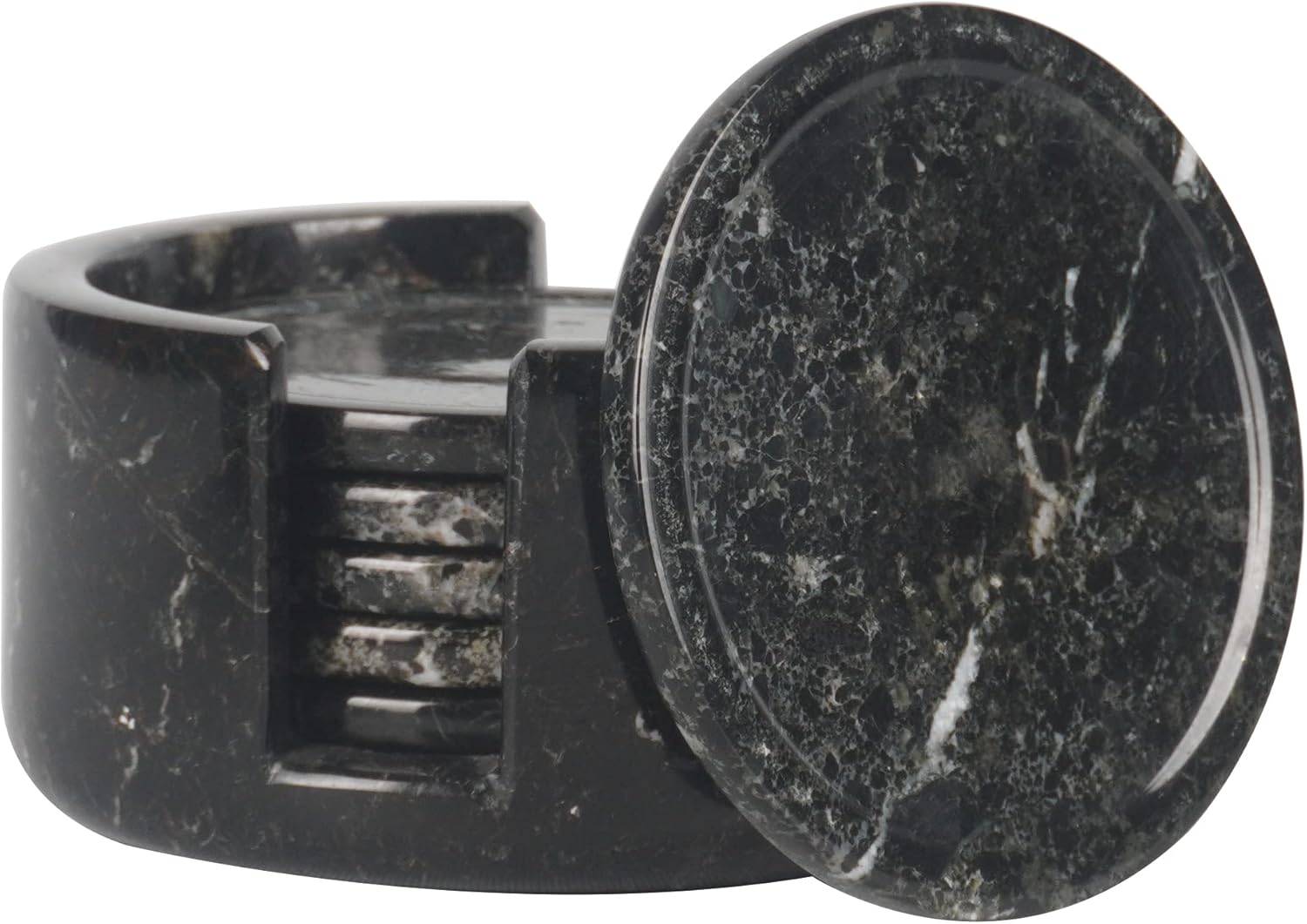 - Set of 6 with Holder Included - Includes 6 round stone coasters with a matching holder for easy storage and display.