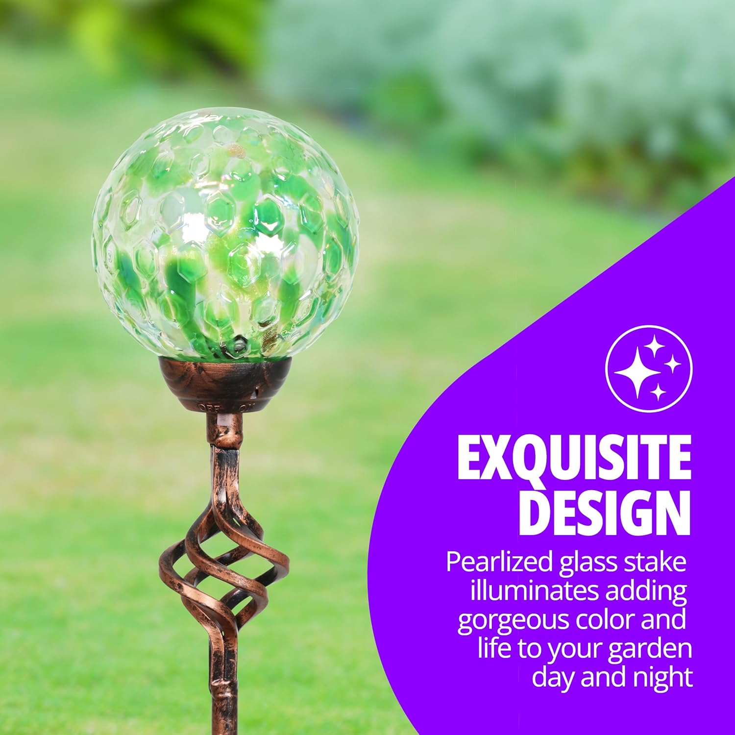 - HAND BLOWN GLASS BUILT TO LAST: Our decorative plant stakes are constructed with beautiful and intricate textured pearlized hand blown glass, UV tested to resist fading, and designed with a striking metal finial for an added touch of elegance to stand up to the outdoor elements; our high end materials ensure that our decorative stakes can stand up to a wide range of outdoor weather conditions