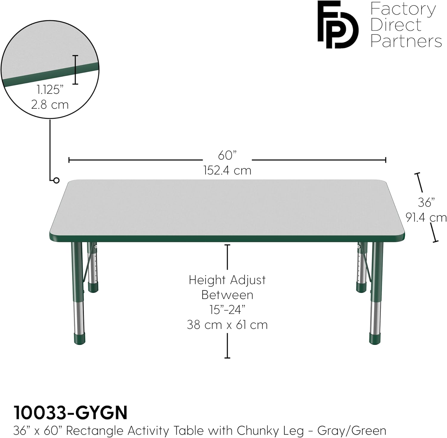 Factory Direct Partners FDP Rectangle Activity School and Classroom Kids Table (36 x 60 inch), Toddler Leg, Adjustable Height 15-24 inches - Gray Top and Green Edge