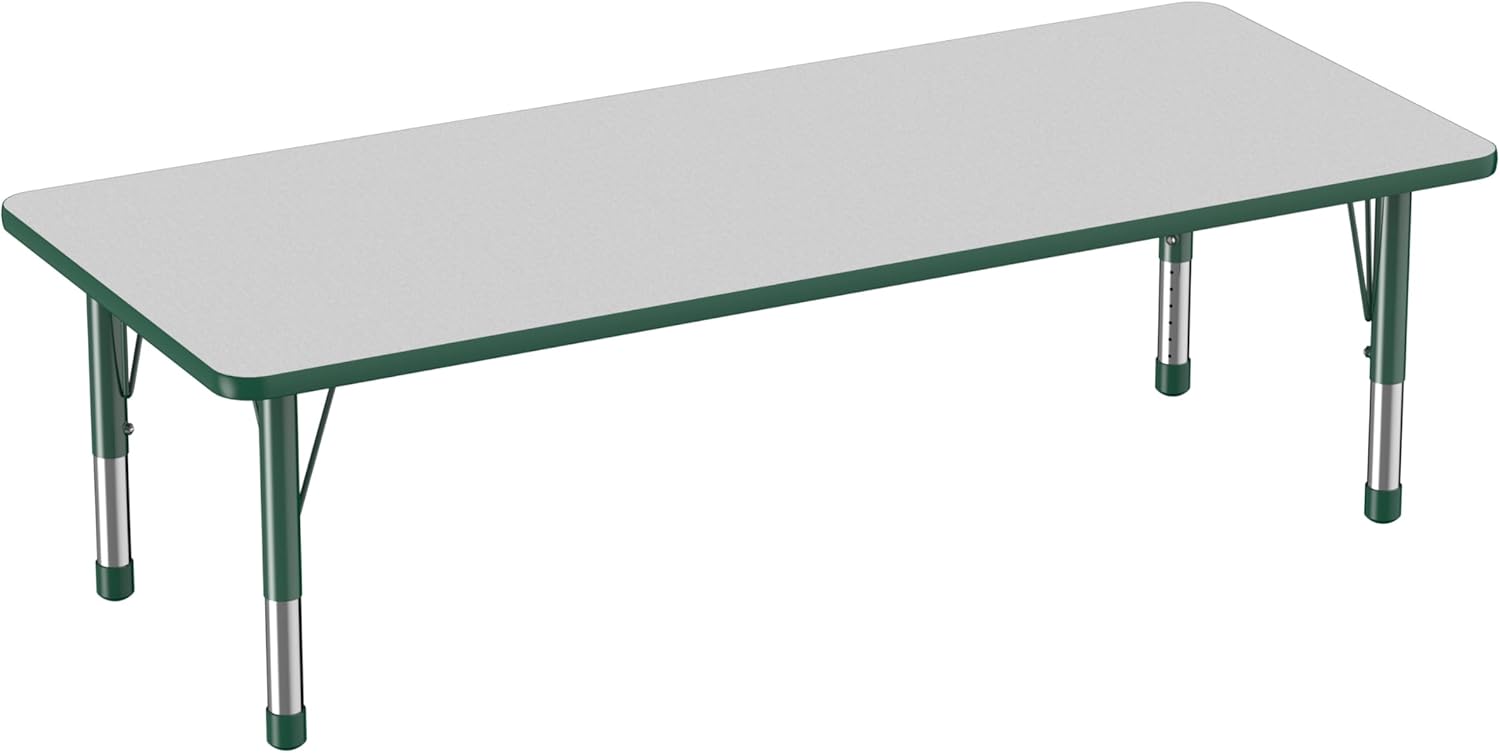 FDP Rectangle Activity School and Classroom Kids Table (30 x 72 inch), Chunky Toddler Leg, Adjustable Height 15-24 inches - Gray Top and Green Edge