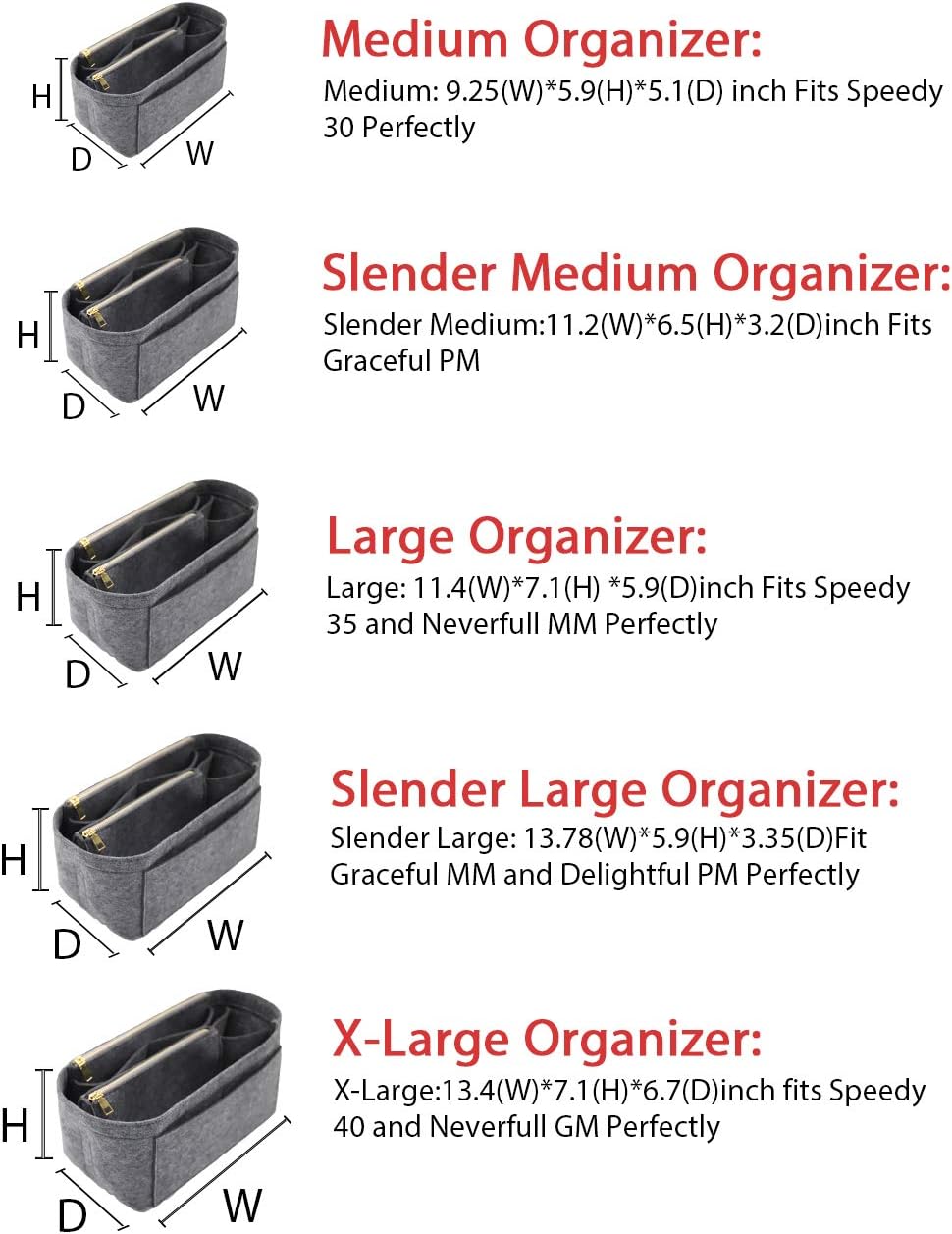 • SIZE OF BAG ORGANIZER: Medium: 9.25(L)*5.9(H)*5.1(W) inch Fits Speedy 30 Perfectly. Slender Medium: 11.2(L)*6.5(H)*3.2(W)inch Fits Graceful PM. Large: 11.4(L)*7.1(H) *5.9(W)inch Fits Speedy 35 and Neverfull MM Perfectly. Slender Large: 13.78(L)*5.9(H)*3.35(W)Fit Graceful MM and Delightful PM Perfectly. X-Large:13.4(L)*7.1(H)*6.7(W)inch fits Speedy 40 and Neverfull GM Perfectly. Portable and Compact Purse Perfectly For any Brand.L*H*W means (Length*Height*Width)