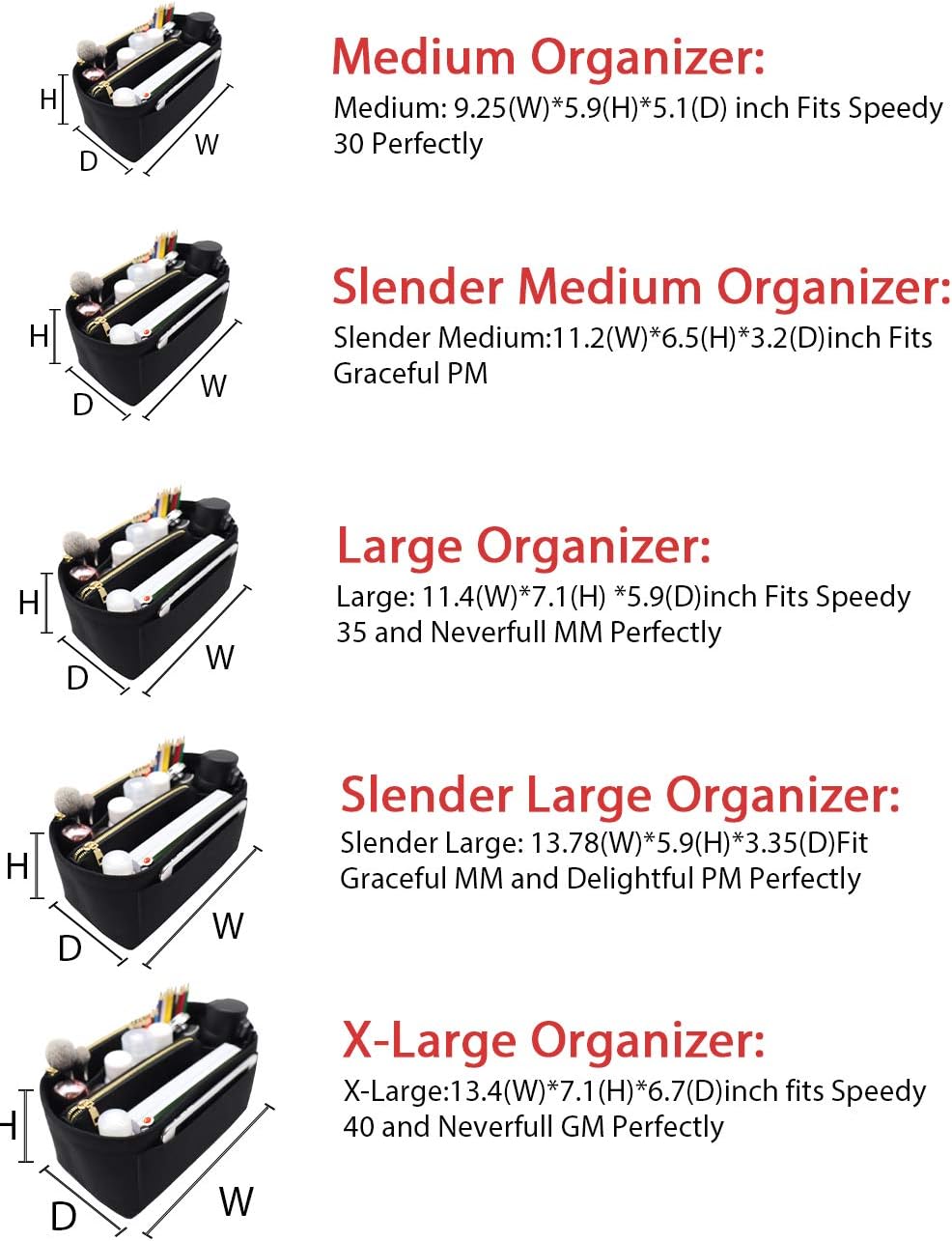 - SIZE OF BAG ORGANIZER: Medium: 9.25(L)*5.9(H)*5.1(W) inch Fits Speedy 30 Perfectly. Slender Medium: 11.2(L)*6.5(H)*3.2(W)inch Fits Graceful PM. Large: 11.4(L)*7.1(H) *5.9(W)inch Fits Speedy 35 and Neverfull MM Perfectly. Slender Large: 13.78(L)*5.9(H)*3.35(W)Fit Graceful MM and Delightful PM Perfectly. X-Large:13.4(L)*7.1(H)*6.7(W)inch fits Speedy 40 and Neverfull GM Perfectly. Portable and Compact Purse Perfectly For any Brand.L*H*W means (Length*Height*Width)