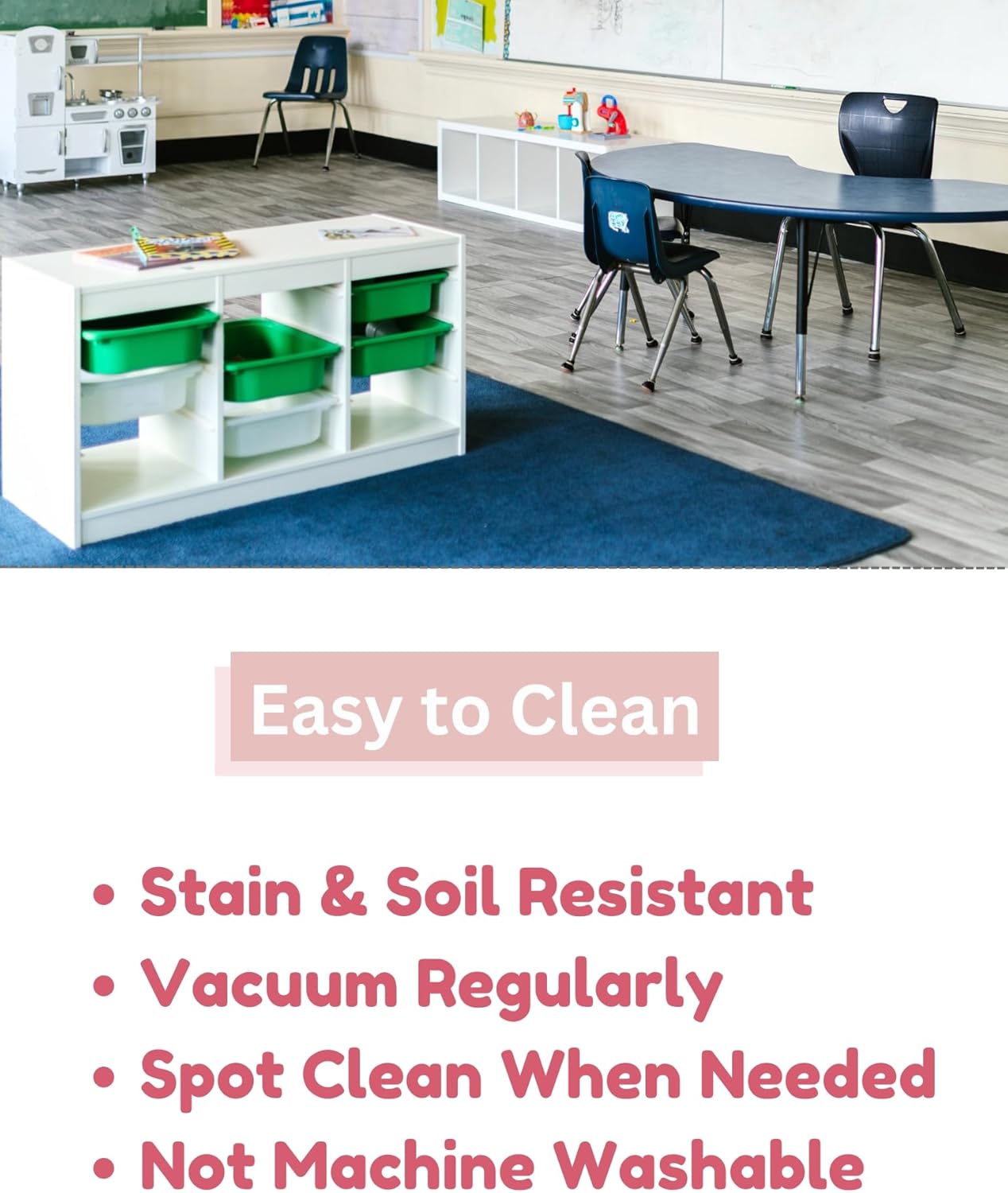 - Durable and versatile classroom area rug: This custom cut low-pile rug is ideal for classrooms, play areas, and high-traffic zones. Its durable, stain-resistant surface makes it easy to maintain, while the custom sizing ensures a perfect fit in any learning or activity space. A great area rug solution for schools, daycares, or home learning environments.