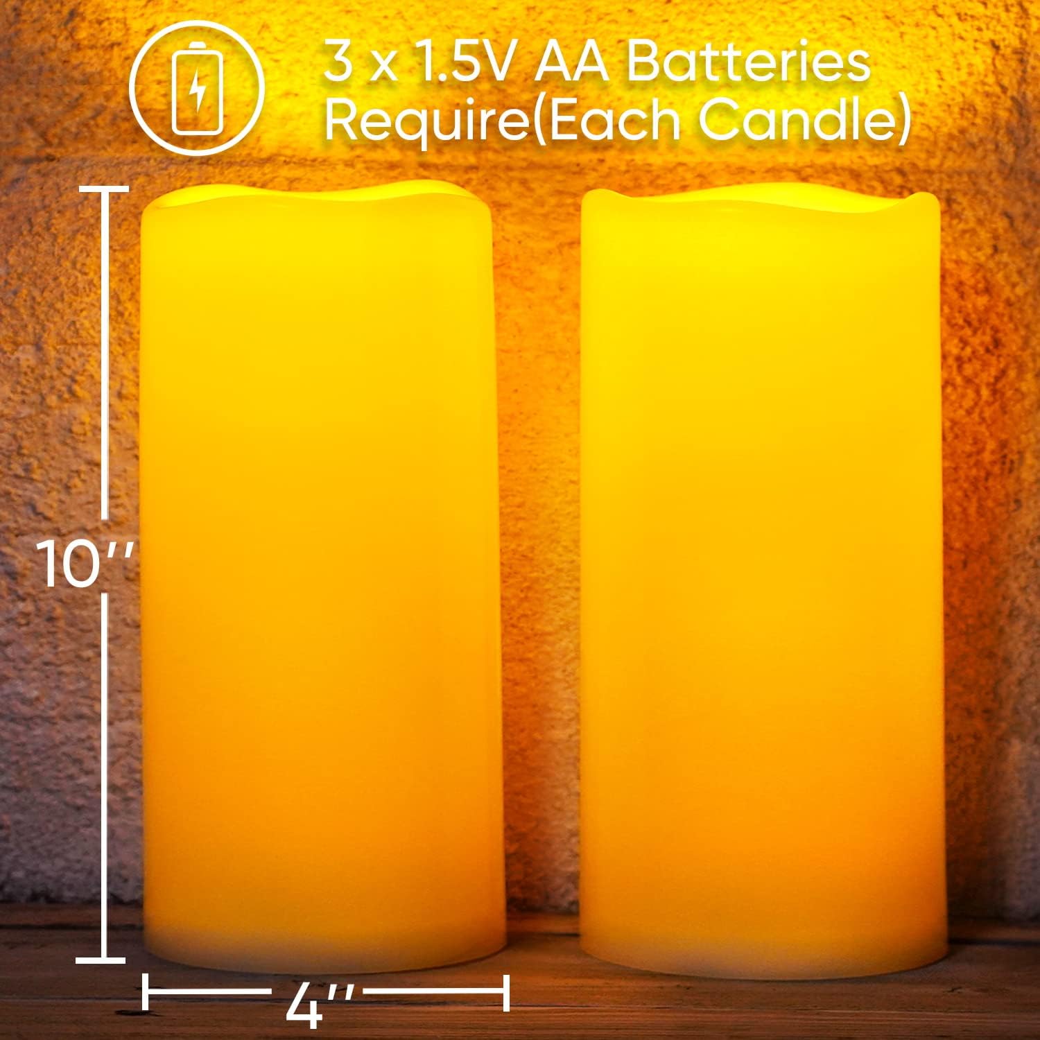 - Package Include: 2 x large outdoor flameless candles (10” in height and 4” in diameter), 1x 10-key remote control, and a user manual. Any question just contact us by clicking the “contact seller”.