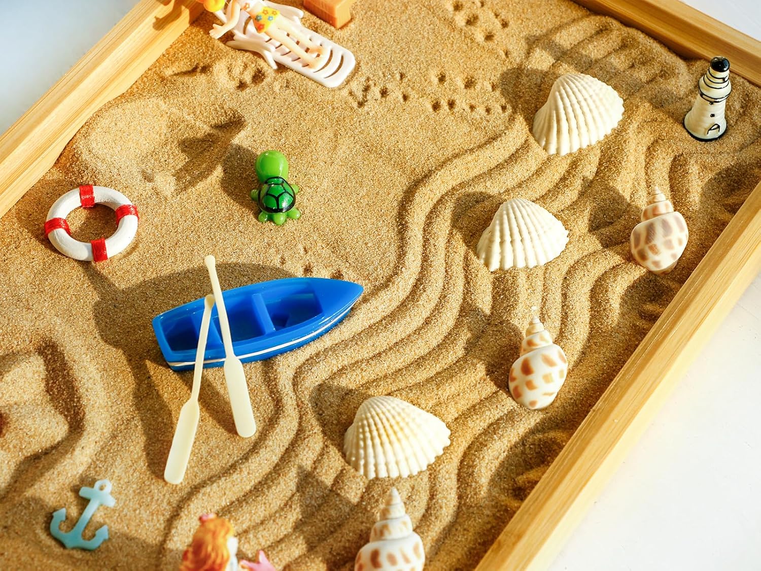 - KIT INCLUDES - The set are well worth the price features 23pcs beach miniatures, including 11 "L* 7.5 "W *1.1 "H Bamboo tray.Use this mini tabletop sand Zen garden! Relieve stress, pursuing inner peace. Wish you enjoy your beach time