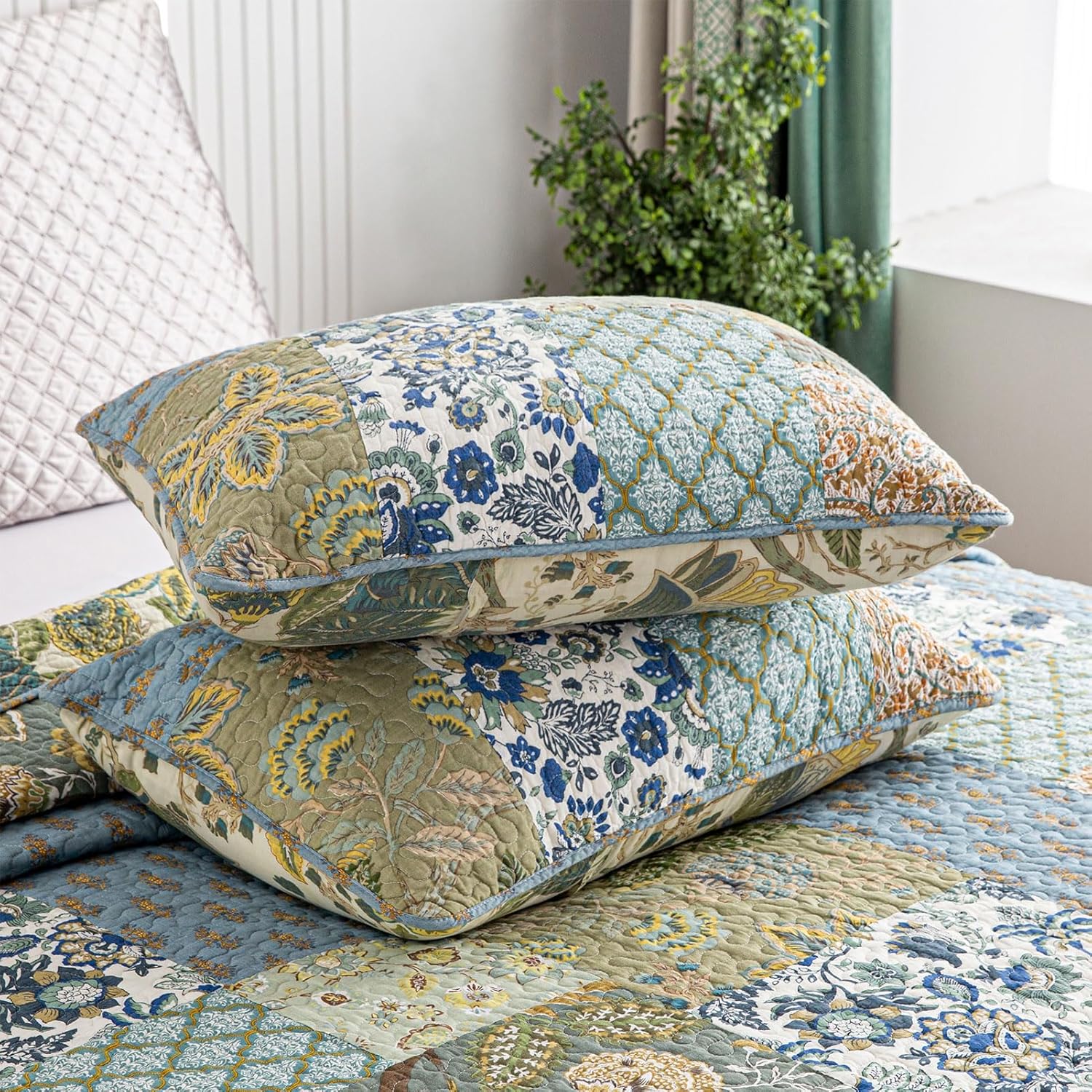 YAYIDAY Oversized King Bedspreads Patchwork Quilt Set (120x118 Inch) - 100% Cotton Reversible Breathable Green Leaves Quilted Coverlet with Pillow Shams for All Seasons