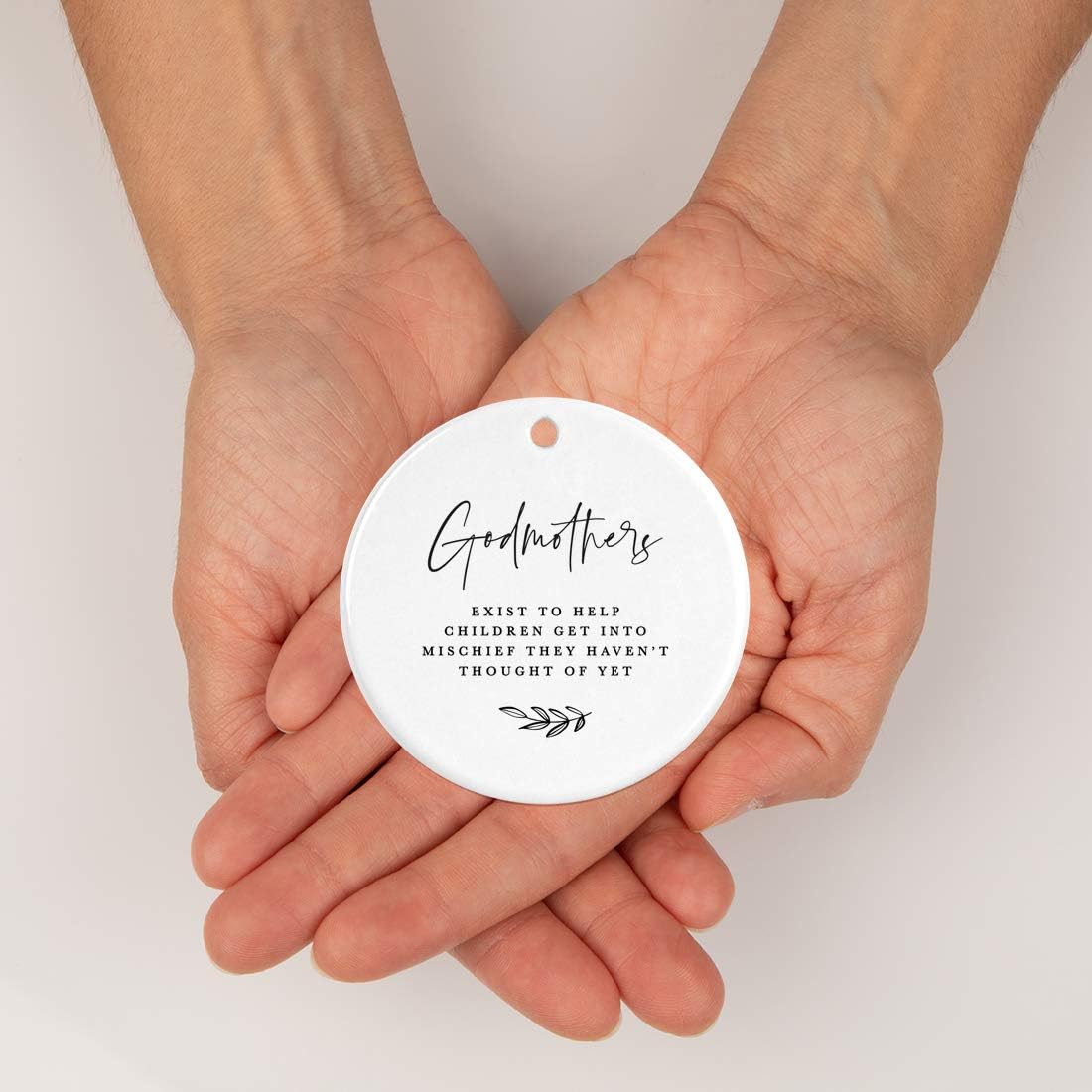 Andaz Press Round Ceramic Porcelain Christmas Tree Ornament Keepsake Collectible Godmother Gift, Godmothers Exist to Help Children Get Into Mischief They Haven't Thought of Yet, 1-Pack