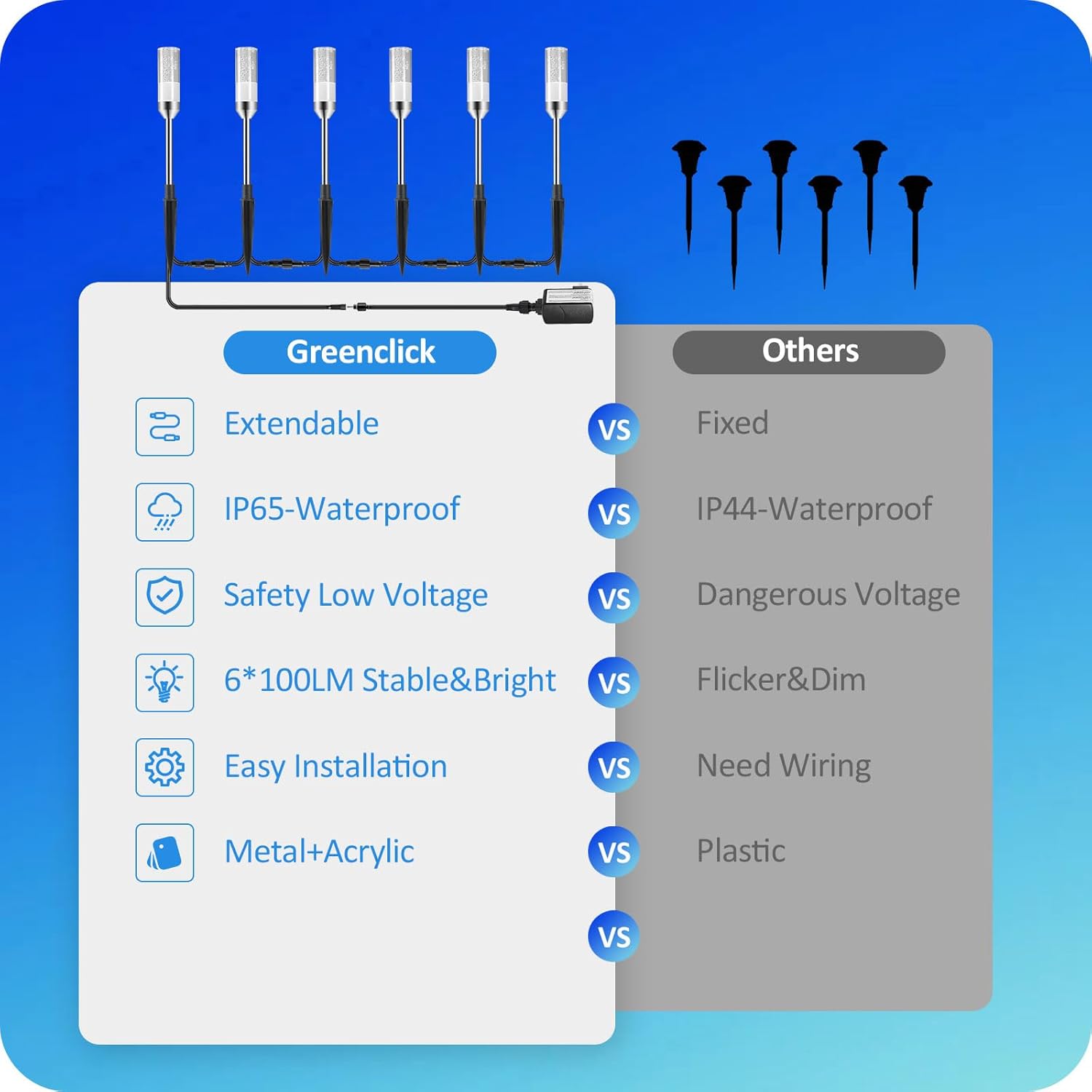 - Safe Low Voltage Landscape Lighting: GreenClick 12v landscape lighting with a transformer that transforms the 120-volt household current to a safer 12 volts, don't require an extra-low voltage transformer, and wire - plug and play. No risk of overheating or burning.