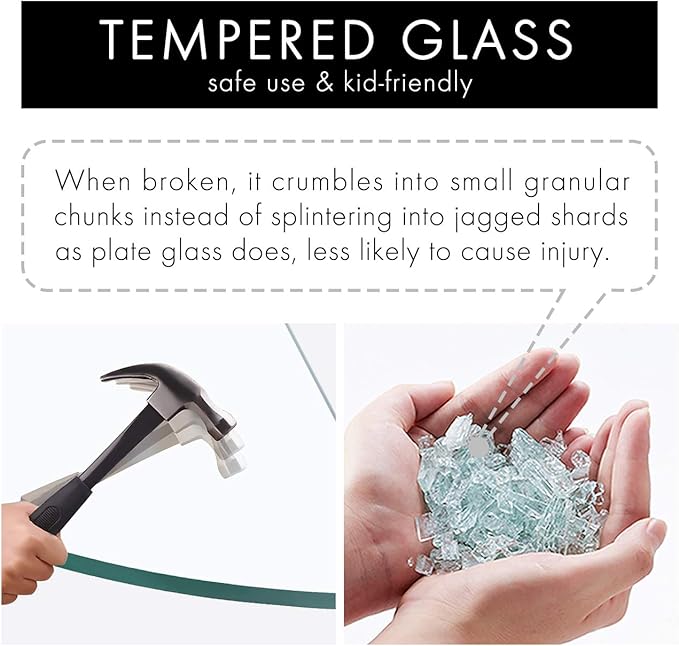 - TEMPERED GLASS: 7-mm extra thick tempered glass, Safe use. When broken, it crumbles into small granular chunks instead of splintering into jagged shards as plate glass does, less likely to cause injury. We tested our glass shelves to ensure that two brackets of each shelf can safely hold tempered glass, with a maximum weight of 11 lb.