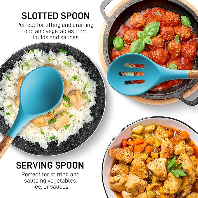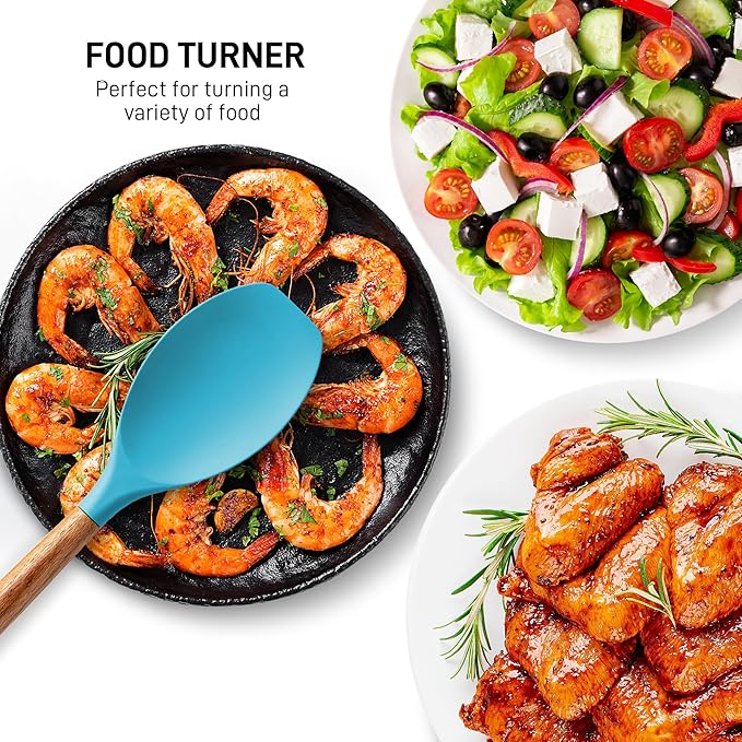 - PREMIUM QUALITY THAT LASTS: These kitchen utensils are made of food-grade silicone with a heat resistance of up to 464°F, making these ideal for stirring food in hot pans. The handles are crafted from authentic acacia hardwood, perfect for long-term use.