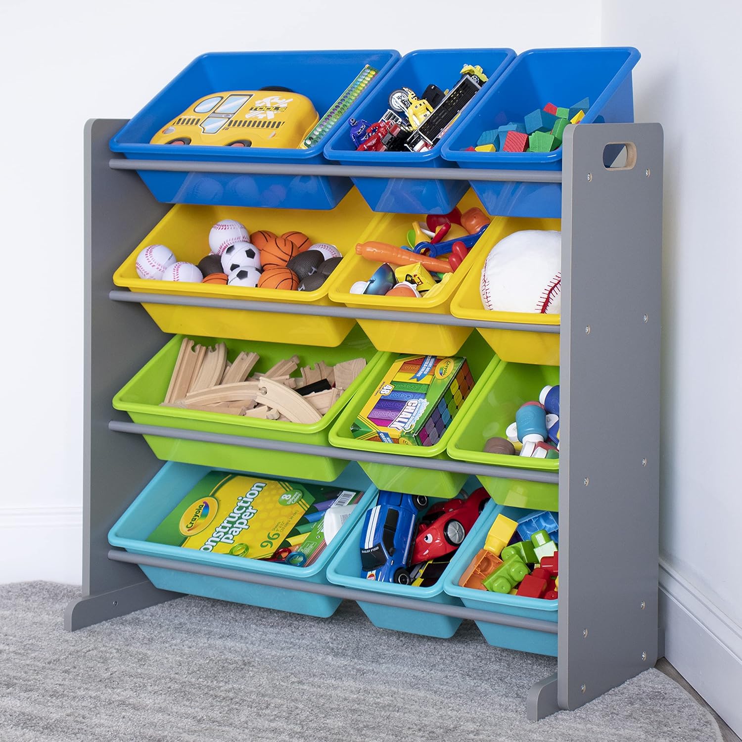 Humble Crew Kids Toy Storage Organizer with 12 Plastic Bins, Grey/Blue/Green/Yellow – Removable Bins for Playroom, Bedroom, Toddler Furniture for Boys and Girls Ages