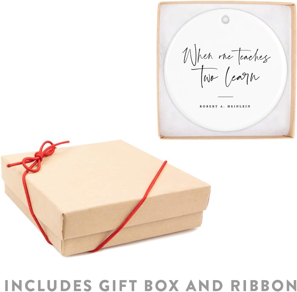 Andaz Press Round Ceramic Porcelain Christmas Tree Ornament for Teacher Thank You Appreciation Graduation Gift, When One Teaches, Two Learn, Robert A. Heinlein, 1-Pack