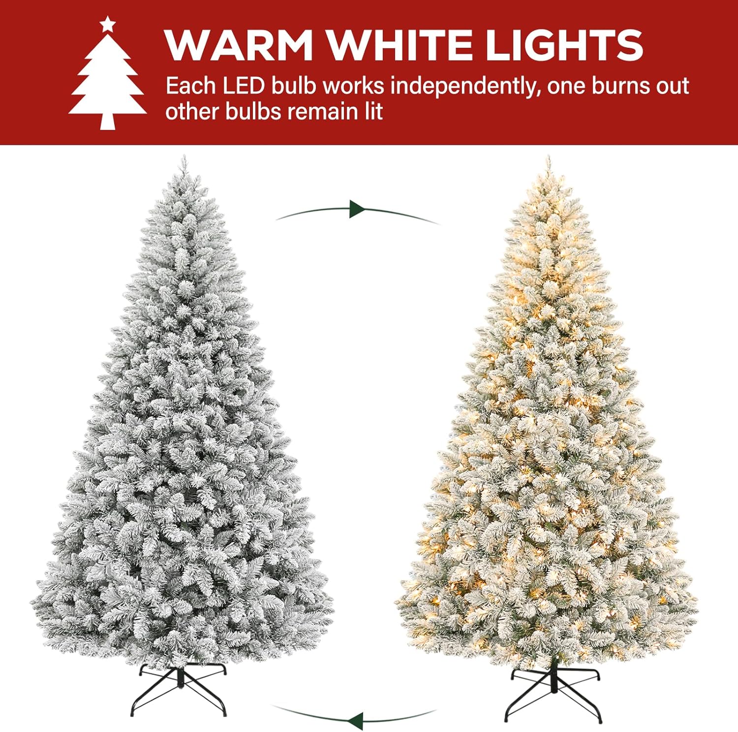 - NATURAL & FULL LOOK: The 7.5 ft lush evergreen snow flocked Christmas tree boasts 1446 branch tips for a full look, pre-strung with 450 warm white LED lights emitting a warm natural glow. The tree also provides abundant space to showcase your favorite holiday ornaments.