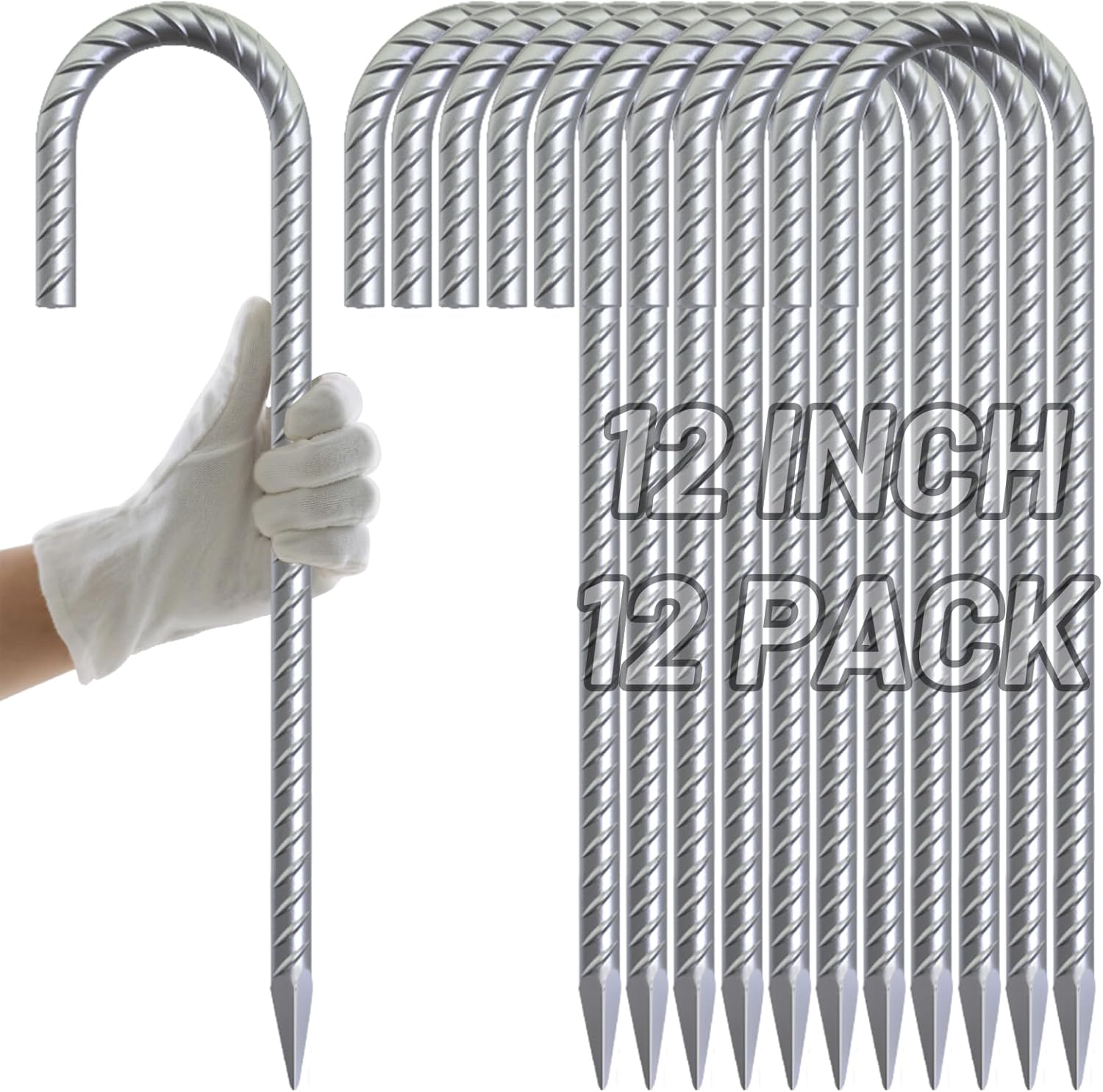 AAGUT Rebar Stakes 12 inch Galvanized Metal Tent Stakes 3/8" Heavy Duty Ground Anchor Stake for Large Canopy and Fence, J Hook Stakes Easy to Push into Hard Soil,12 Pack
