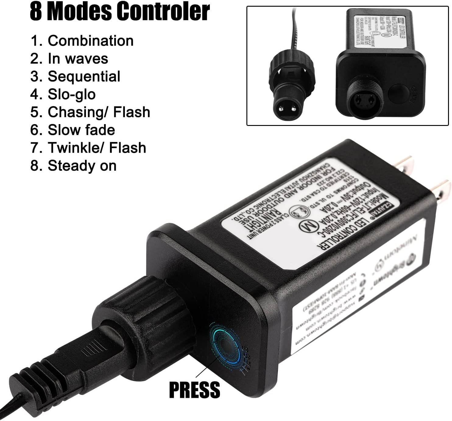 - End to end extendable: Maximum connectable 6 strands to customize your need for large area and festival decorations, 5.9 inches tail cord with key designed female connector for quick and easy connection 8 fantastic flashing modes: Press the press button on ac adapter repeatedly to select 1. combination, 2. in waves, 3. sequential, 4. slow glow, 5. chasing or flash, 6. slow fade, 7 .twinkle or flash or 8. steady on working mode