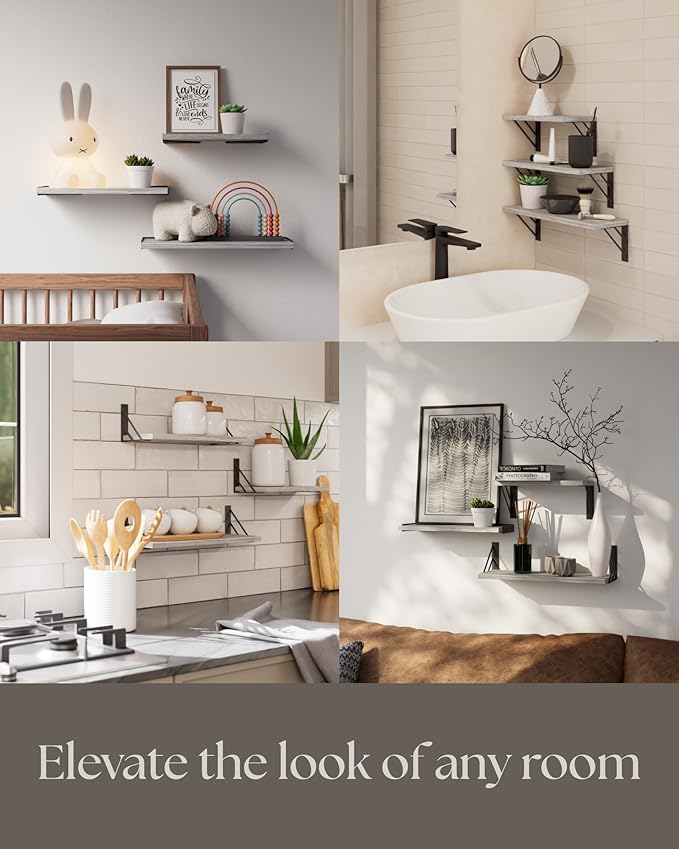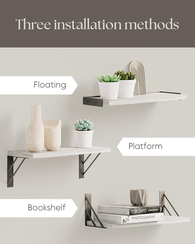 - 【Simple Combinations, More Creativity】 Added triangle design elements to provide two different display methods. Install these shelves with the board on top of the brackets or below to provide more choices for your layout. Choose your favorite look and create your own personal style. Natural Wood boards can be DIY stained.