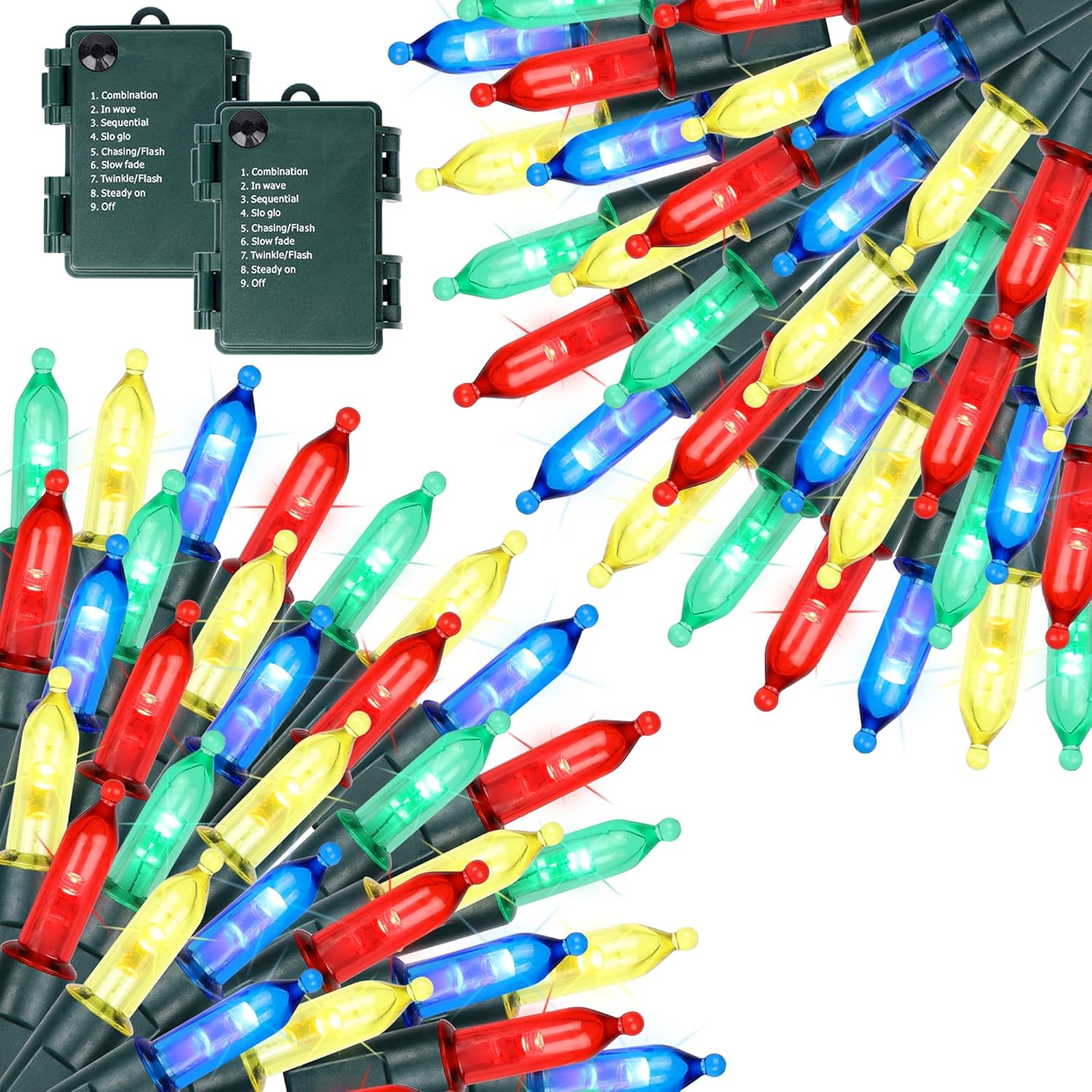 - BATTERY OPERATED WITH TIMER: 3 AA batteries are required for power supply (NOT INCLUDED). Press button on the battery case for 8 modes adjusting: COMBINATION, IN WAVES, SEQUENTIAL, SLOGS, CHASING/FLASH, SLOW FADE, TWINKLE/FLASH and STEADY ON. Just light up the light with any mode you like to create great festival holiday joy atmosphere