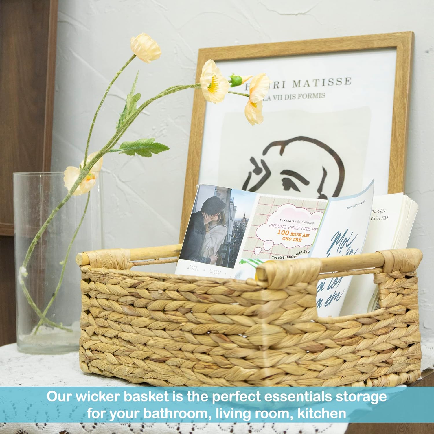 - ✅ Natural & High Quality - Our wicker storage baskets for shelf are made of Water Hyacinth, was carefully handcrafted to perfection. It comes with an iron frame for sturdy storage. The wooden handles on both sides are not only pretty but to help you easy to carry the wicker basket.