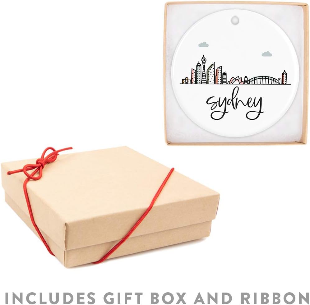 Andaz Press Round Ceramic Porcelain Christmas Tree Ornament Keepsake Gift, Sydney, Colorful International City Skyline Graphic, 1-Pack, Birthday Ideas Family Coworker Him Her, Gift Box