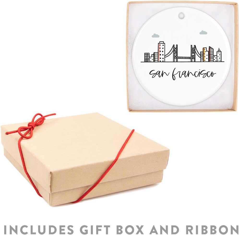Andaz Press Round Ceramic Porcelain Christmas Tree Ornament Keepsake, San Francisco, Colorful City Skyline Graphic, 1-Pack, Birthday Gift Ideas Family Coworker Him Her, Includes Gift Box