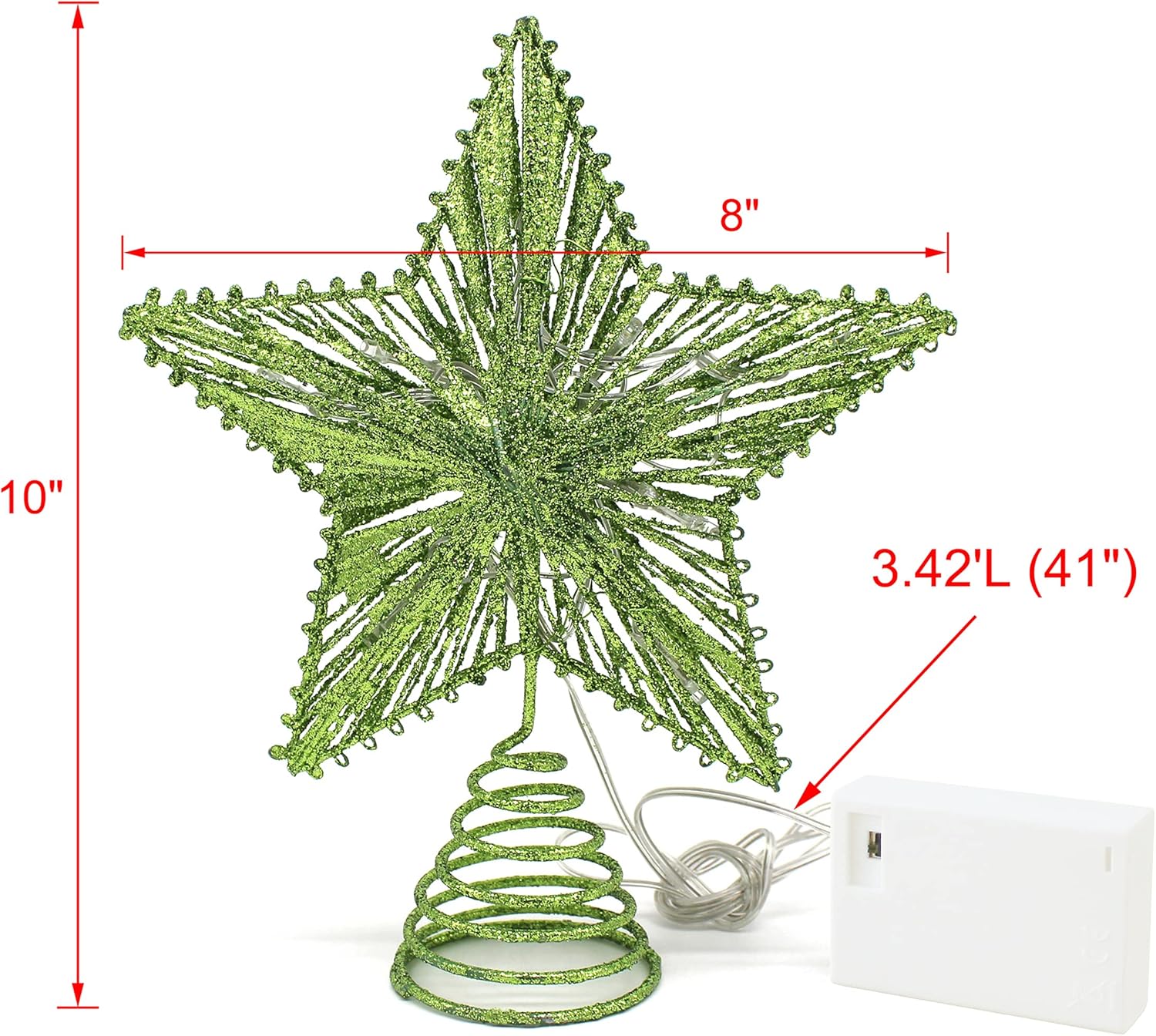 CVHOMEDECO. Green Glittered 3D Tree Top Star with Warm White LED Lights and Timer for Christmas Tree Decoration and Holiday Seasonal Décor, 8 x 10 Inch