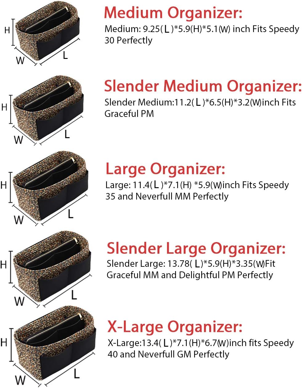 • SIZE OF BAG ORGANIZER: Medium: 9.25(L)*5.9(H)*5.1(W) inch Fits Speedy 30 Perfectly. Slender Medium: 11.2(L)*6.5(H)*3.2(W)inch Fits Graceful PM. Large: 11.4(L)*7.1(H) *5.9(W)inch Fits Speedy 35 and Neverfull MM Perfectly. Slender Large: 13.78(L)*5.9(H)*3.35(W)Fit Graceful MM and Delightful PM Perfectly. X-Large:13.4(L)*7.1(H)*6.7(W)inch fits Speedy 40 and Neverfull GM Perfectly. Portable and Compact Purse Perfectly For any Brand.L*H*W means (Length*Height*Width)
