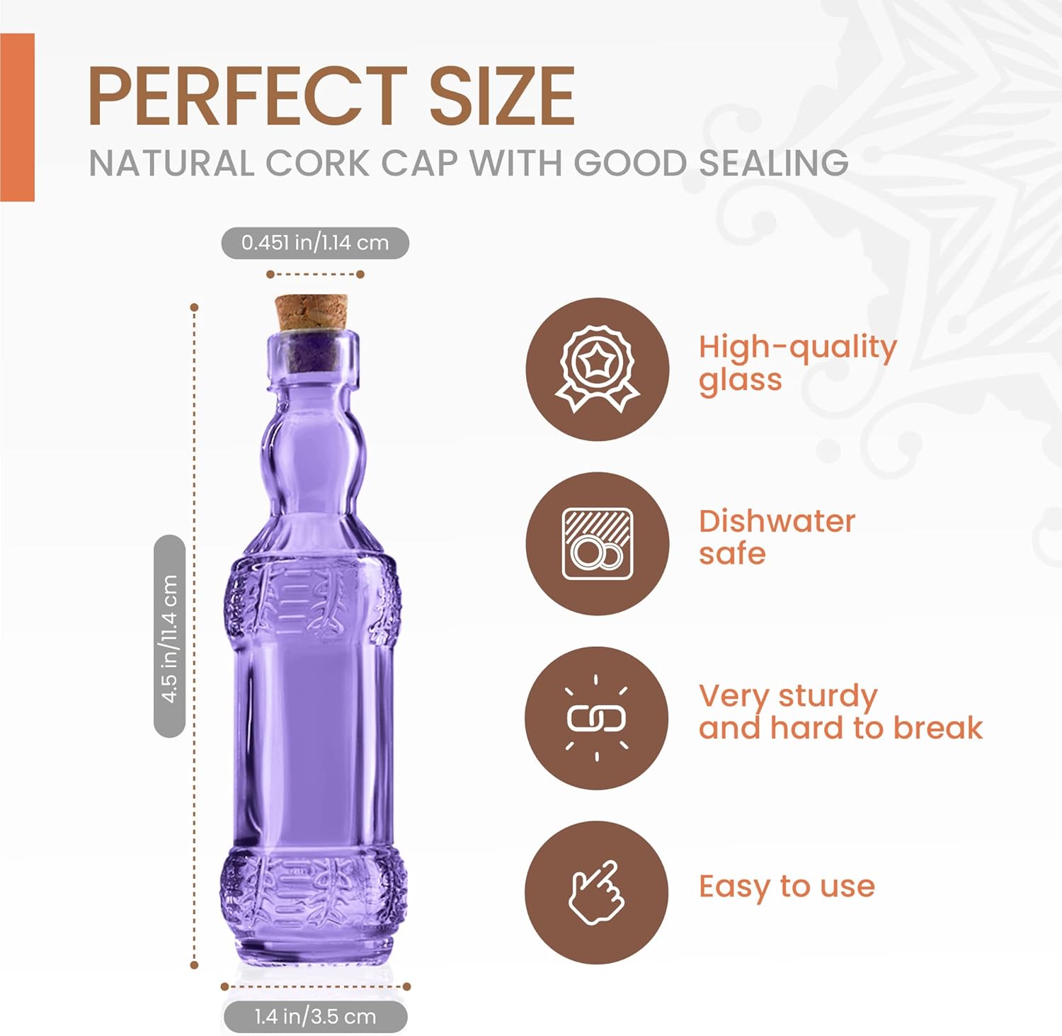- Perfect Accessory for your Home Decor: 12 Pcs Glass Bottles. Bottle mouth diameter: 0.45 inch (1.14cm), bottle height(Without Cork): 4.6 inch (11.43cm), bottom diameter: 1.4 inch (3.56cm).