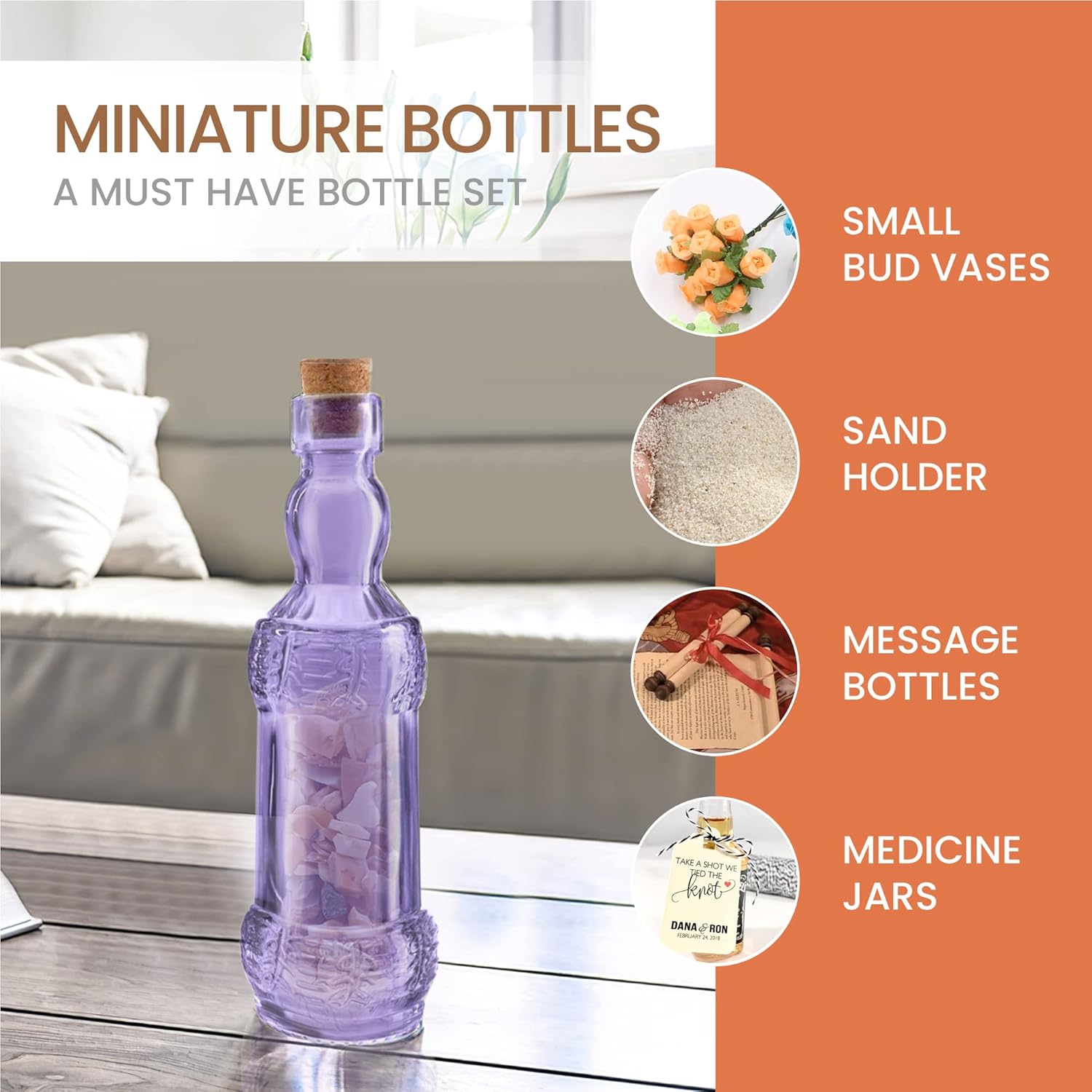 - 101 Use In Homes: Small bud vases, sand holder, message bottles, wedding favors, medicine jars, mini treasures holder, table decor, DIY projects, restaurants and small offices decorations, tree bottles, decorative wine bottles, shot bottles, liquor bottles, witch jars, perfume bottles, Christmas Gift, Halloween, Valentines Day etc.