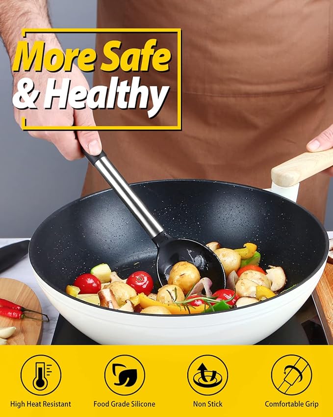 - Thoughtful Design : The good-quality 18/8 stainless steel keeps you away from the trouble of kitchen utensils rusting or breaking; This anti-scald silicone handle is not easy to conduct heat and is more comfortable to hold than traditional utensils