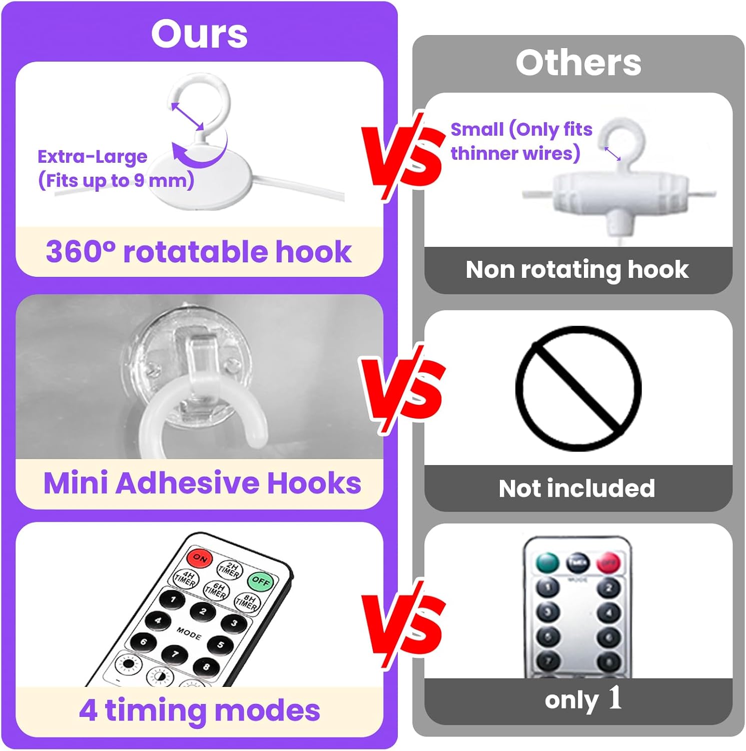 - 【360° Rotatable hooks】: Upgrade 360° Rotation Clips on each drop string is mainly used for hooking on curtains. It can be hung at any angle, such as on wall, window or other surface. Also includes 16 sets of Damage-free adhesive hooks. No nails needed and holds strongly & removes cleanly. Both of these two clips make the curtain light easily to be hung for some special places, not only limited to windows, but also can be hung on flat walls, glass, porches, eaves, etc.