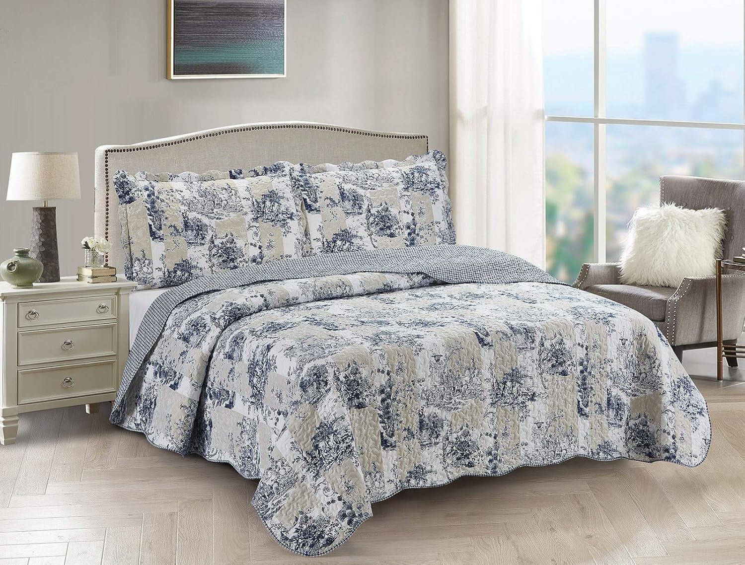 Brilliant Sunshine Blue Toile in Beige and Ivory Patches, 3-Piece Quilt Set with 2 Shams, Reversible Bedspread, Soft Lightweight Coverlet, All-Season, King, Blue