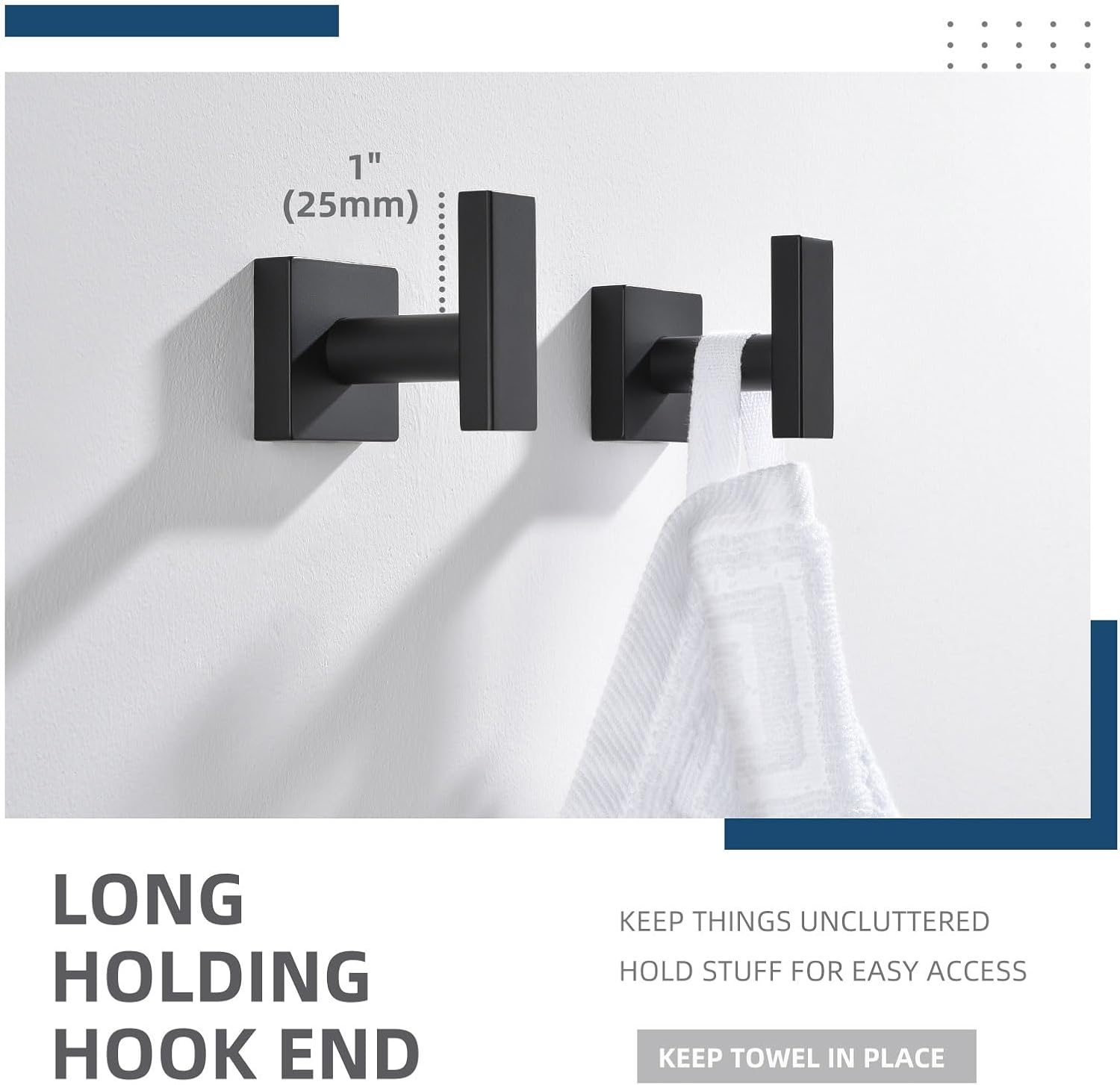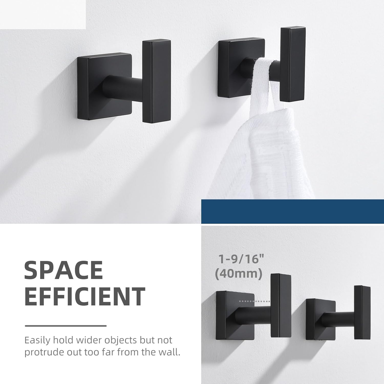 - QUICK DRYING & FIRM MOUNTING: leaves space for drying out towels but not protrude out too far from the wall, secure with no wobble under proper installation, dimension (L*D*H): 1-3/4" x 2-3/8" x 2-1/4"