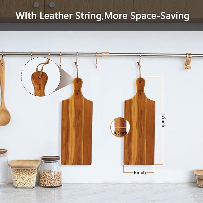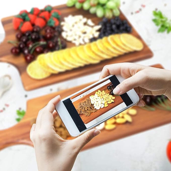 - Suitable Size: Acacia wood cutting board cheese board serving tray; measures 17 inches long with handle, 6 inches wide, 0.5 inches thick; ideal for serving bread, cheese, sandwiches, and party snacks at the table