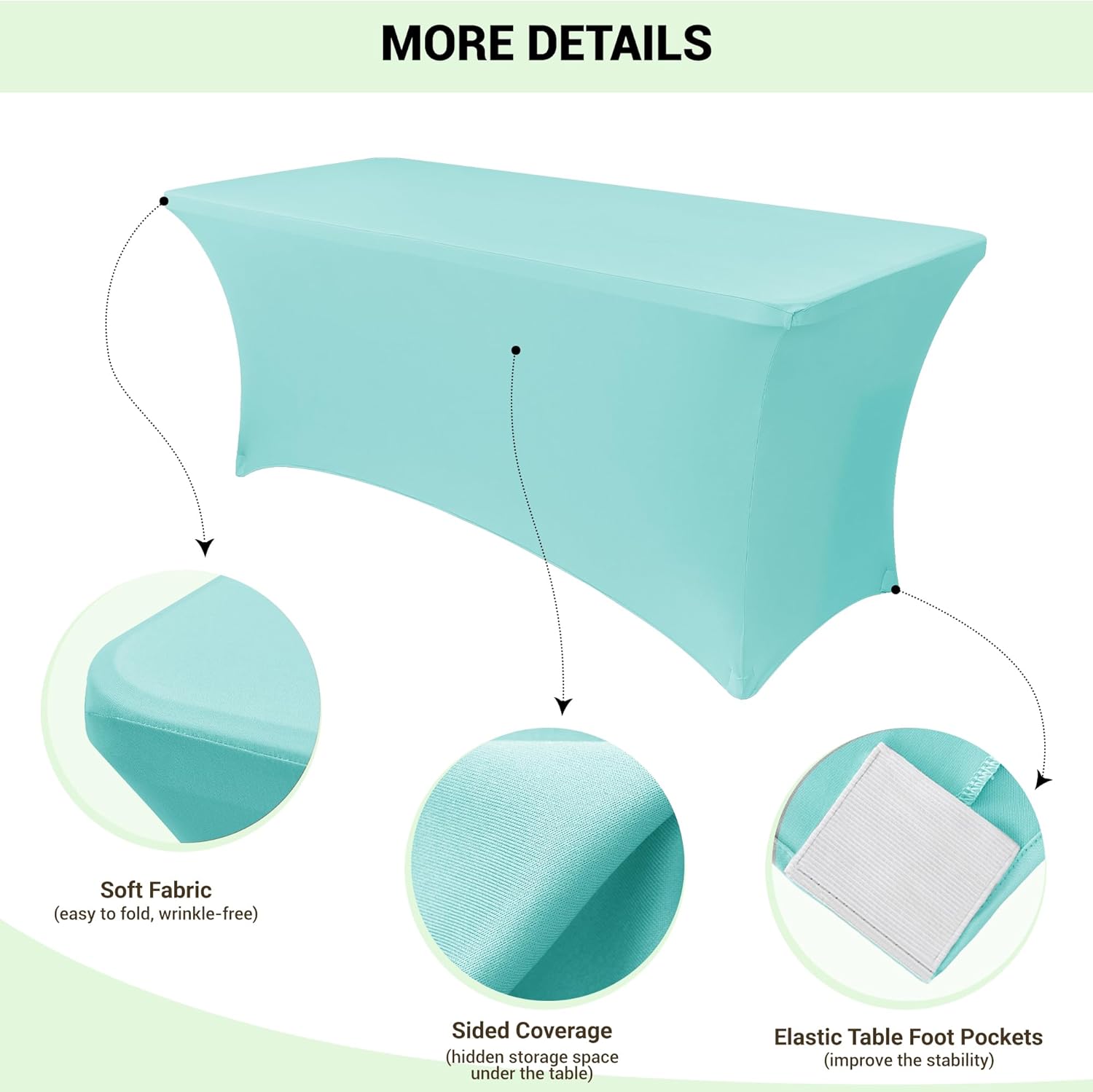 - Features 4 Elastic leg pockets to put the banquet table legs in: The sewn-in leg pockets secure and cover table legs ensuring that every part of the rectangular table is covered and spandex table cloth cover is displayed uniformly