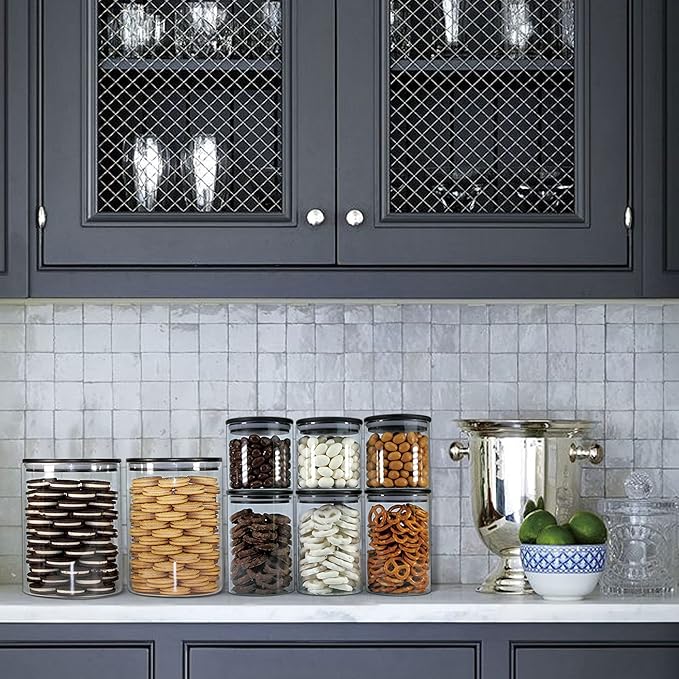 - ✅ 2023 NEW STYLISH BLACK LID: Looking for black and white, cool and stylish home deco? These Urban Green glass food storage canister sets with black lids are perfect for contemporary pantry design. We carefully selected 5 different sizes from 6oz to 100oz that can store any dry food, such as pasta, beans, nuts, cookies, spice or flour. Try our black lids glass jars for a new modern pantry organization.