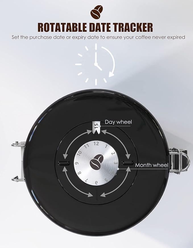 - 【Avoid Deteriorated Coffee】 - With a tight seal by our airtight vacuum sealed coffee container, normal roasted coffee could keep the best flavor within 4-5 weeks. You can easily set storage date or expiry date via the rotated date tracker(Time Adjustment Dial) on the lid, to better control the storage period and always enjoy your coffee in freshness and ultimate flavor