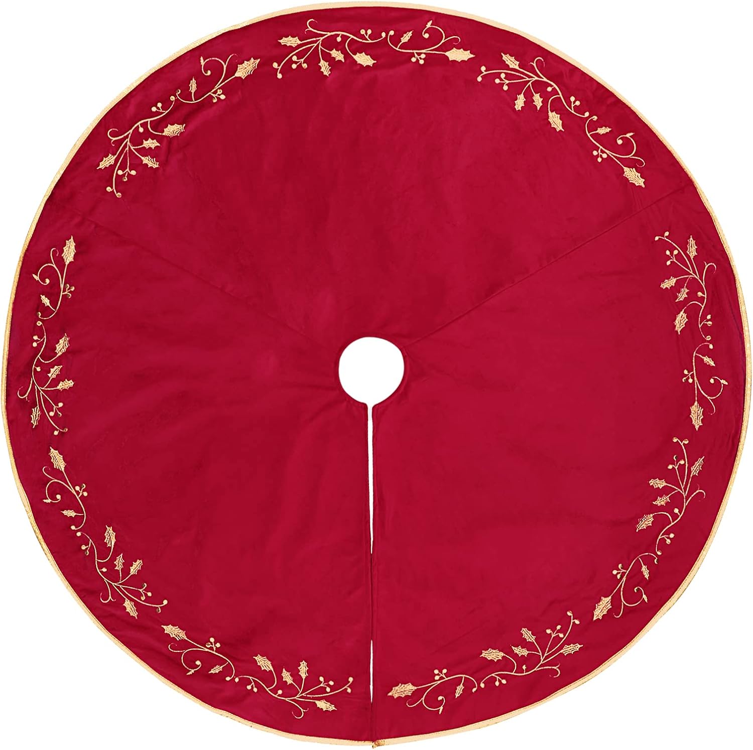 Christmas Tree Skirt, 48 inches Red Luxury Velvet Plush Fur Skirts with Gold Embroidered Holly Leaf for Rustic Xmas Tree Holiday Decorations