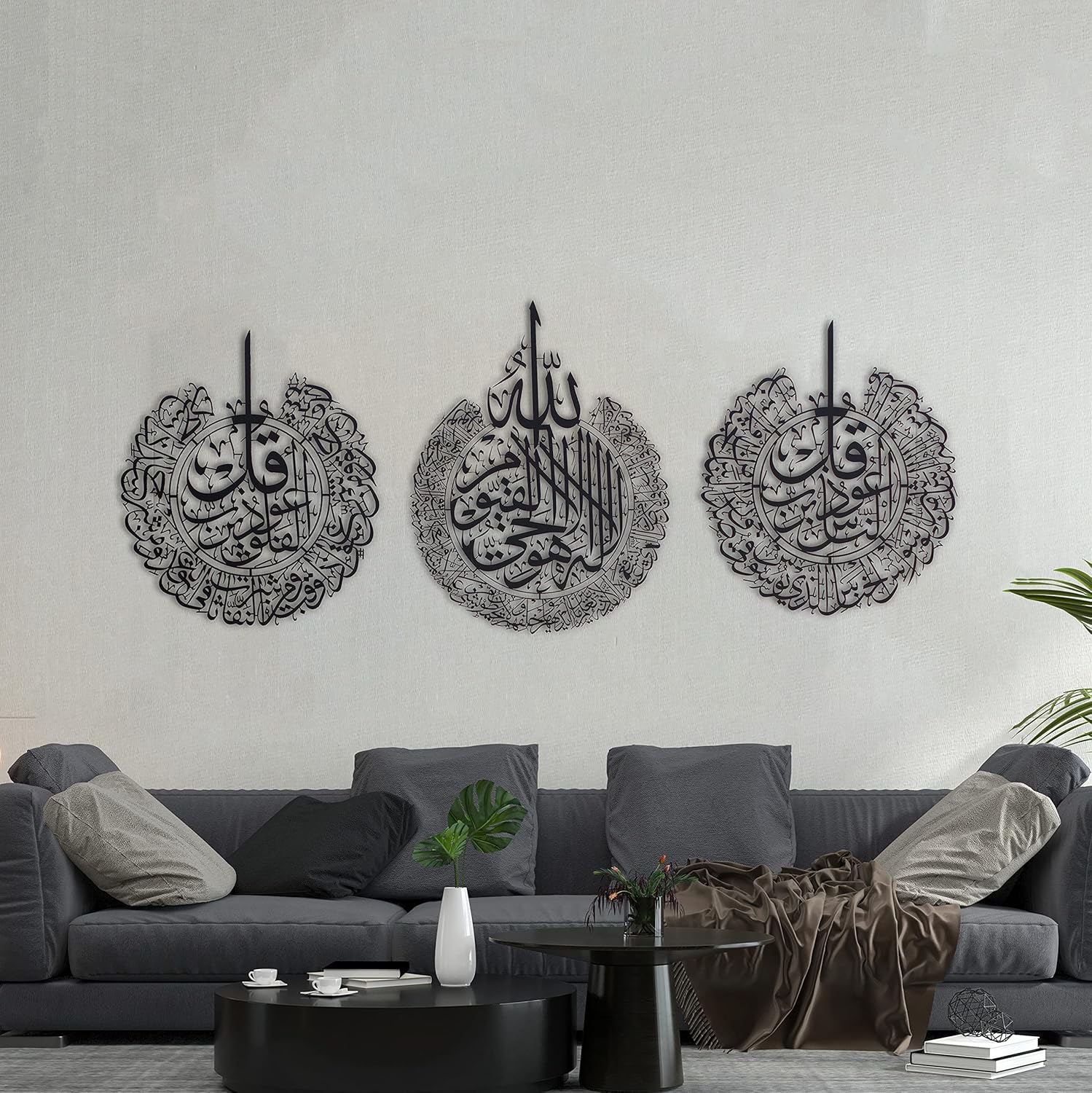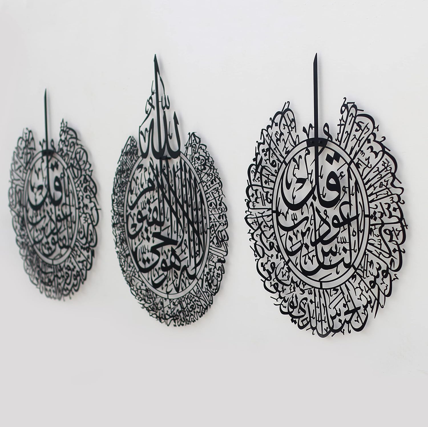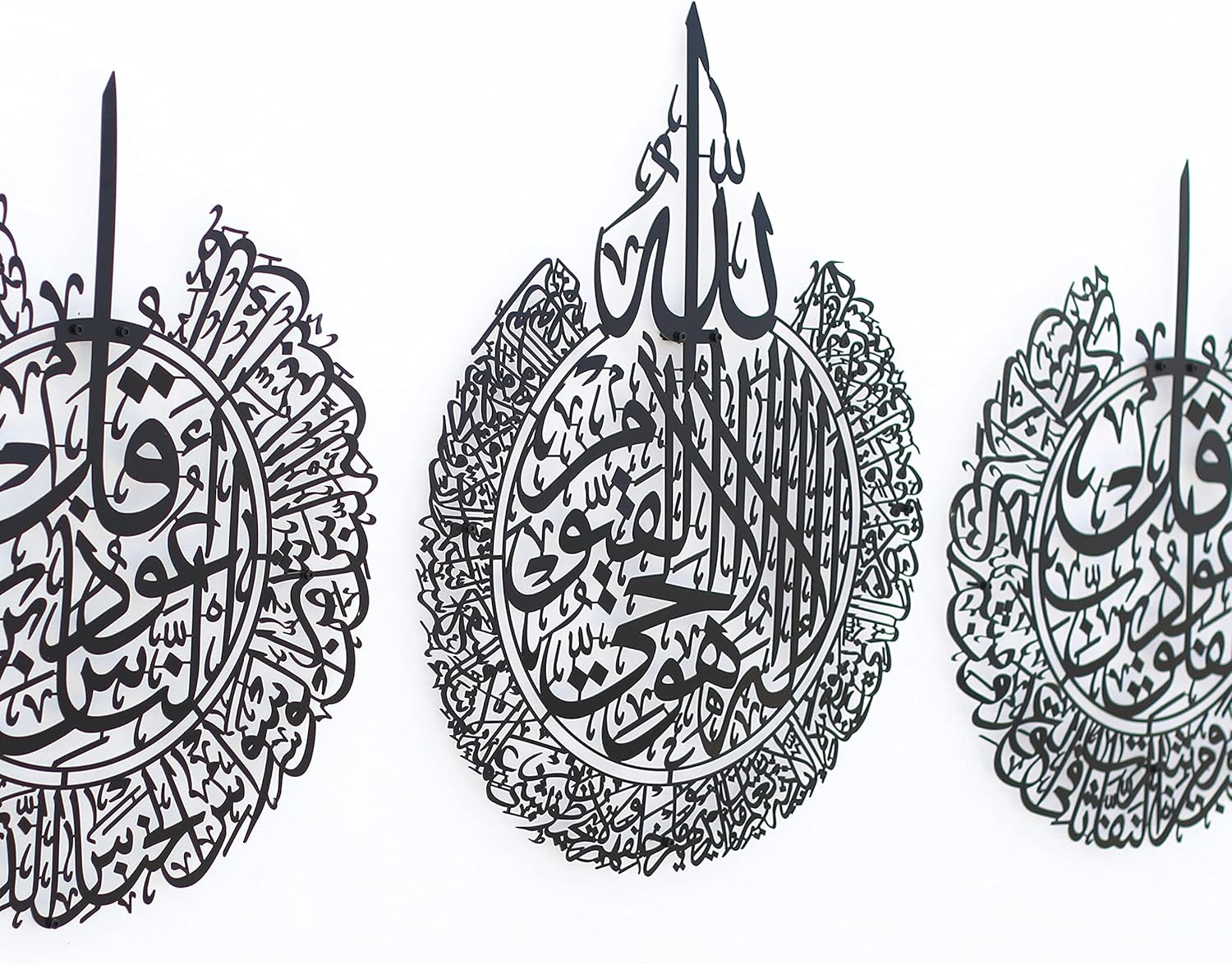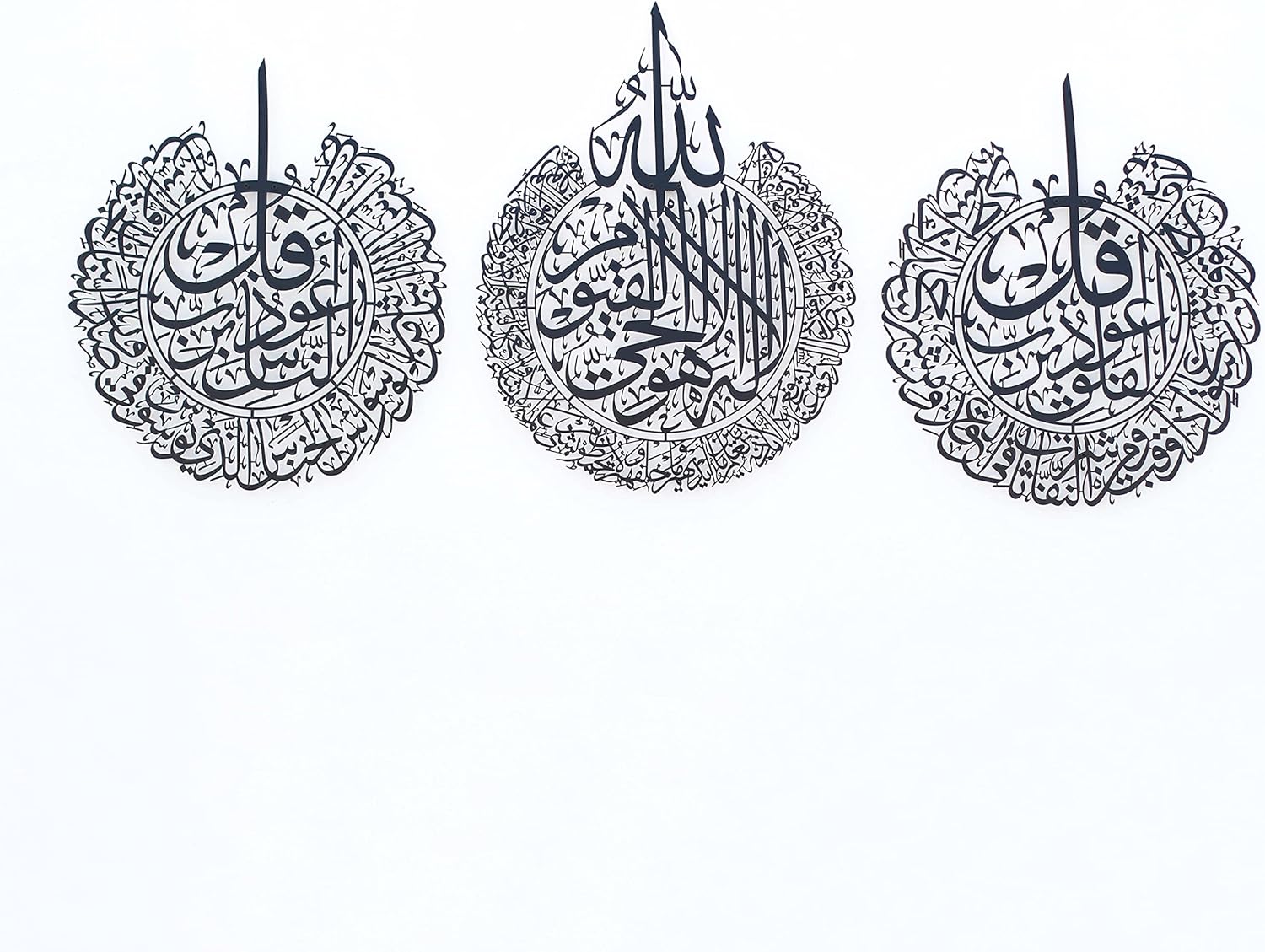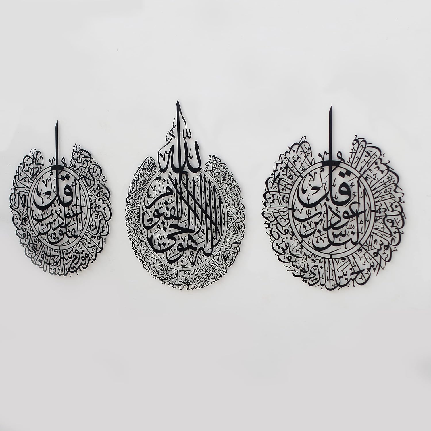 - The Elegance of Art: Crown your home with this elegant metal Islamic wall art. Featuring the Ayat al-Kursi, Surahs al-Falaq, and al-Nas, it's a magnificent union of Quranic verses and masterful Arabic calligraphy.
