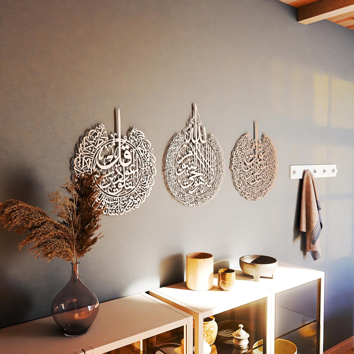 - The Elegance of Art: Crown your home with this elegant metal Islamic wall art. Featuring the Ayat al-Kursi, Surahs al-Falaq, and al-Nas, it's a magnificent union of Quranic verses and masterful Arabic calligraphy.