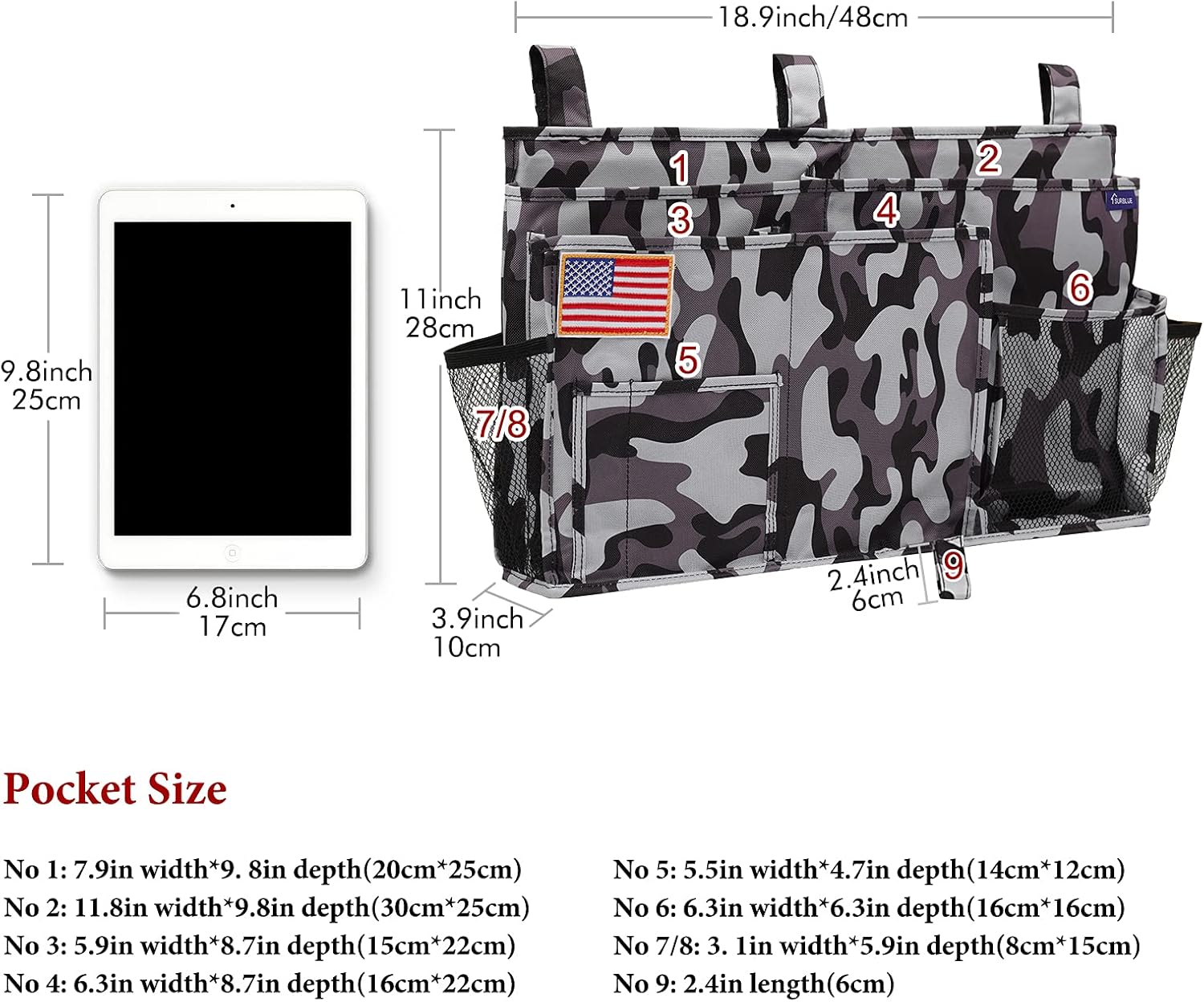 - Size: The large bedside caddy is 19*3.9*11 inches/48*10*28cm. The storage bag has 8 pockets that are bunk bed accessories, meeting the request for multi-storage.