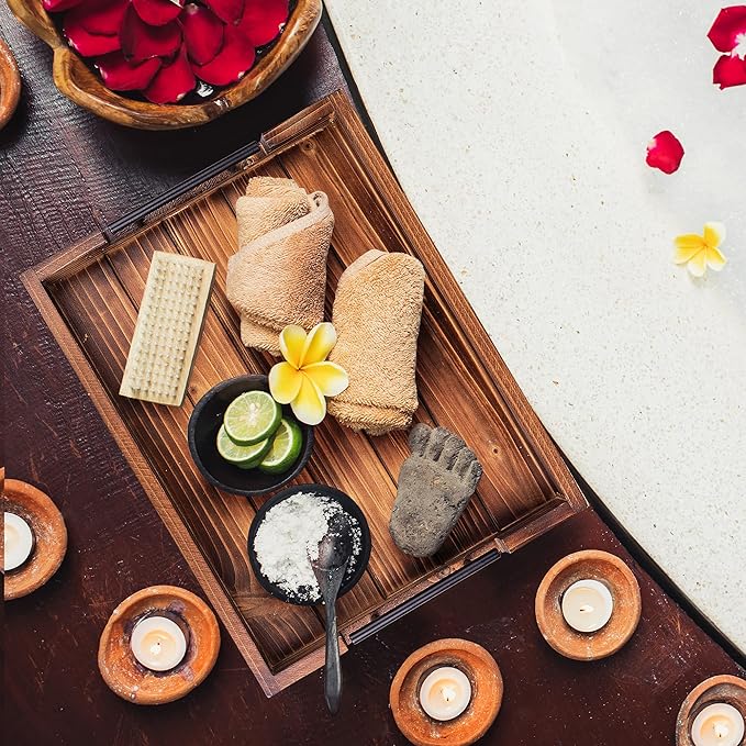 - BEAUTIFUL HANDCRAFTED DESIGN – Carefully crafted from premium quality fir wood material with fine attention to details, our wooden serving tray set or tray for ottoman coffee table has ergonomically fitted metal handles for ease of carrying. Measuring 17”x 13”, this wood serving tray (rectangle) is the ideal size to carry snacks, drinks, and meals around the house without any hassle - WONDERFUL home decor!