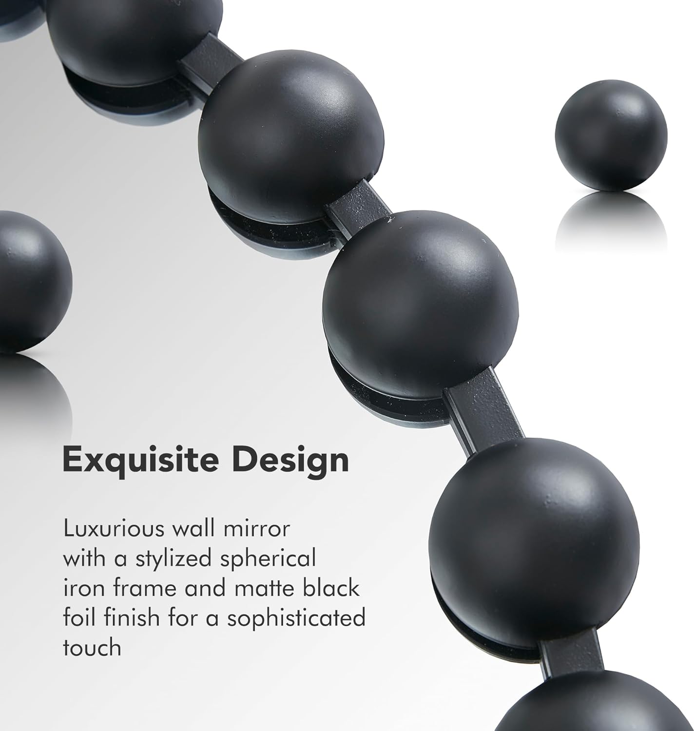 - This round mirror features a stylized spherical iron frame finished with metallic foil, creating a bold and glamorous allure