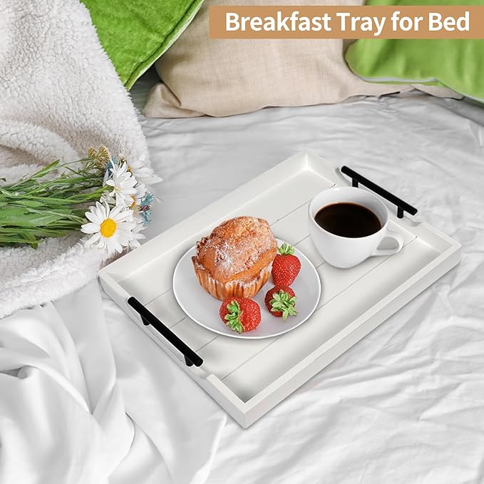 - 【WHO DOESN'T LOVE HANDCRAFTS?】Have to say our rectangle white wood serving tray is so functional and stylish at the same time. Every paint process is completed by our hard workers, who aim to make each beautiful tray to prevent splinters, paint chips, and scratches. It's lightweight but sturdy enough to be used as a coffee table tray for the living room.
