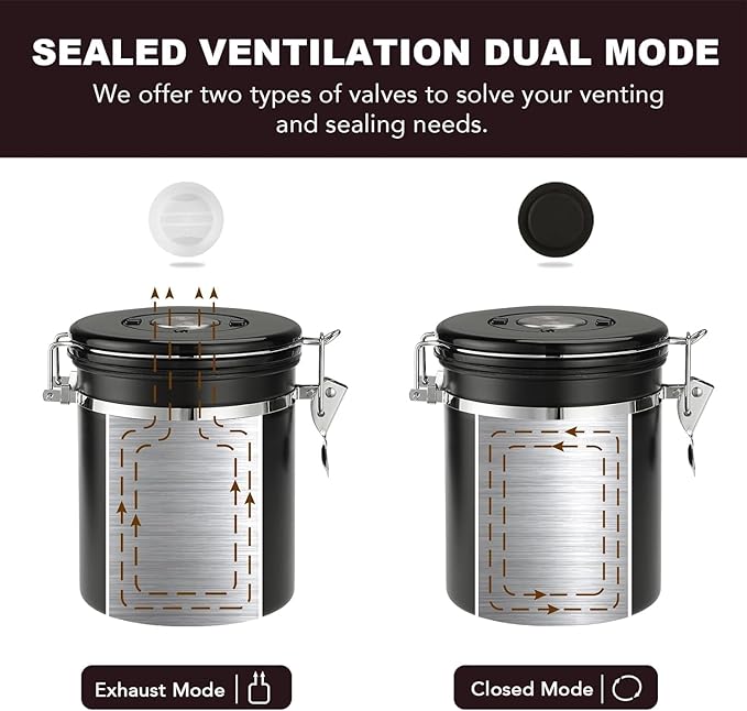 - 【TWO EXHAUST MODES】The canister features a CO₂ valve system and a silicone seal to lock in freshness and keep out moisture and air. A silicone gasket around the edge of the lid ensures an airtight seal when the lid is closed. Storing your coffee beans in this well-designed canister helps extend their freshness and ensures that every cup, even weeks later, tastes as good as the first.
